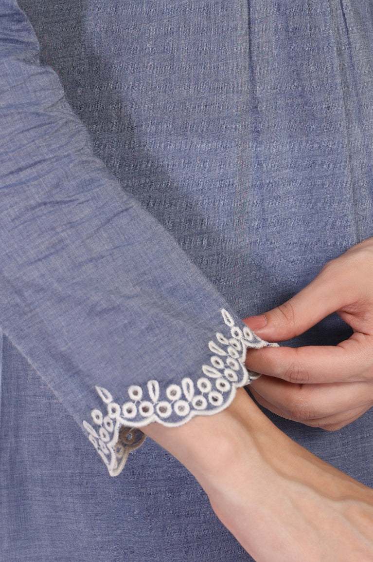 Effortlessly chic, this blue embroidered flared top is a wardrobe essential for every woman. Crafted from breathable cotton, it features a round neckline, long sleeves with lace detailing, and a scalloped hemline for a touch of elegance. Perfect for casual outings or a relaxed day at work, this top pairs beautifully with white trousers or denim for a fresh, stylish look.