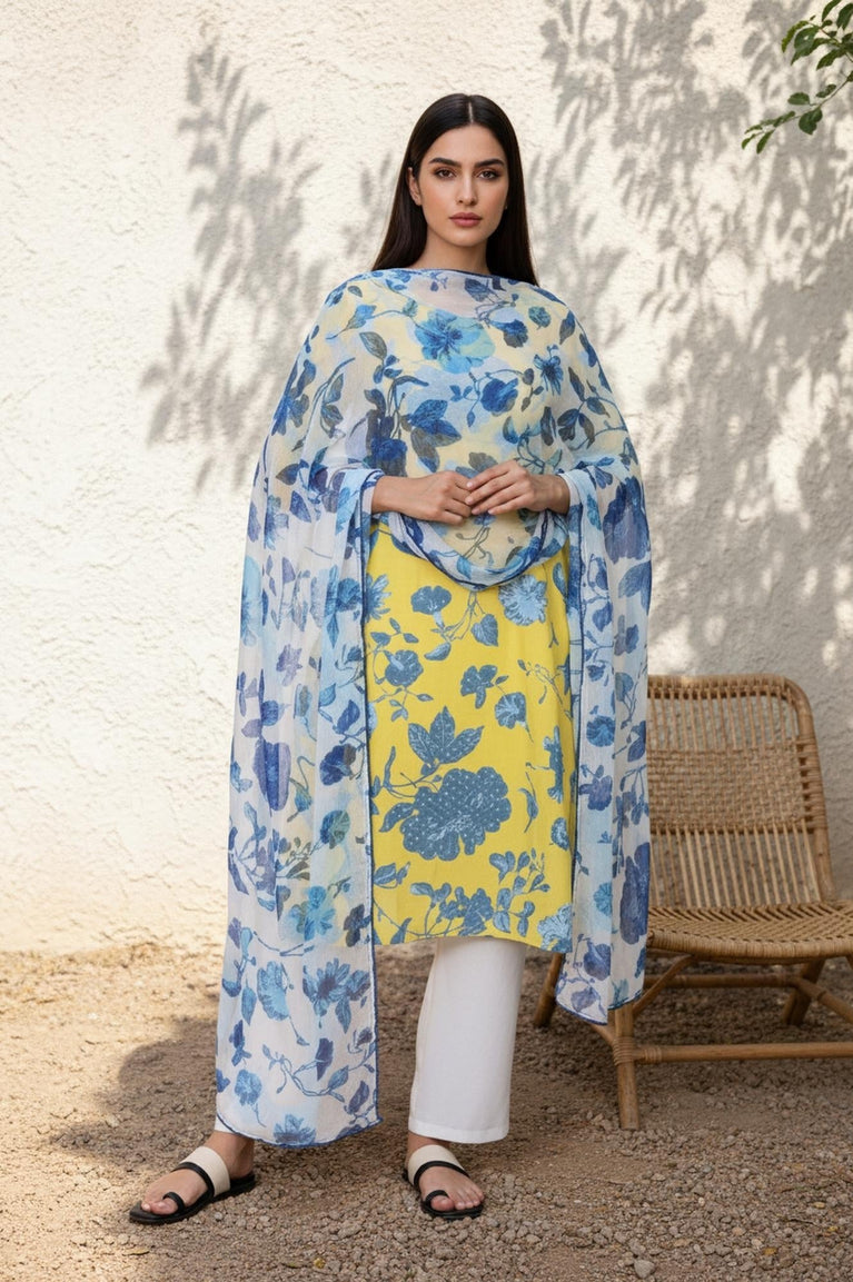 A whisper of floral artistry, this designer dupatta for women floats with effortless grace. Crafted from airy chiffon, its sheer canvas is splashed with a beautiful, large-scale botanical print in dreamy shades of azure and cobalt against a soft, light base. This ethnic dupatta drapes beautifully, its generous length allowing for versatile styling. The entire piece is framed by a delicate, coordinating lace border that adds a touch of refined charm. Perfect for both day-time gatherings and evening soirees, this lightweight stole is the ideal companion for your kurtas and ethnic sets, adding a vibrant pop of color and pattern. It's a must-have accessory that feels as lovely as it looks.