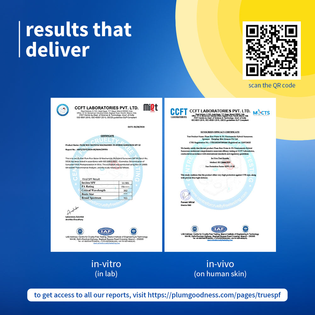 SPF 50 PA++++ sunscreen that provides broad spectrum protection against UVA & UVB rays along with blue light - backed by Plum’s trueSPFᵀᴹ standards.