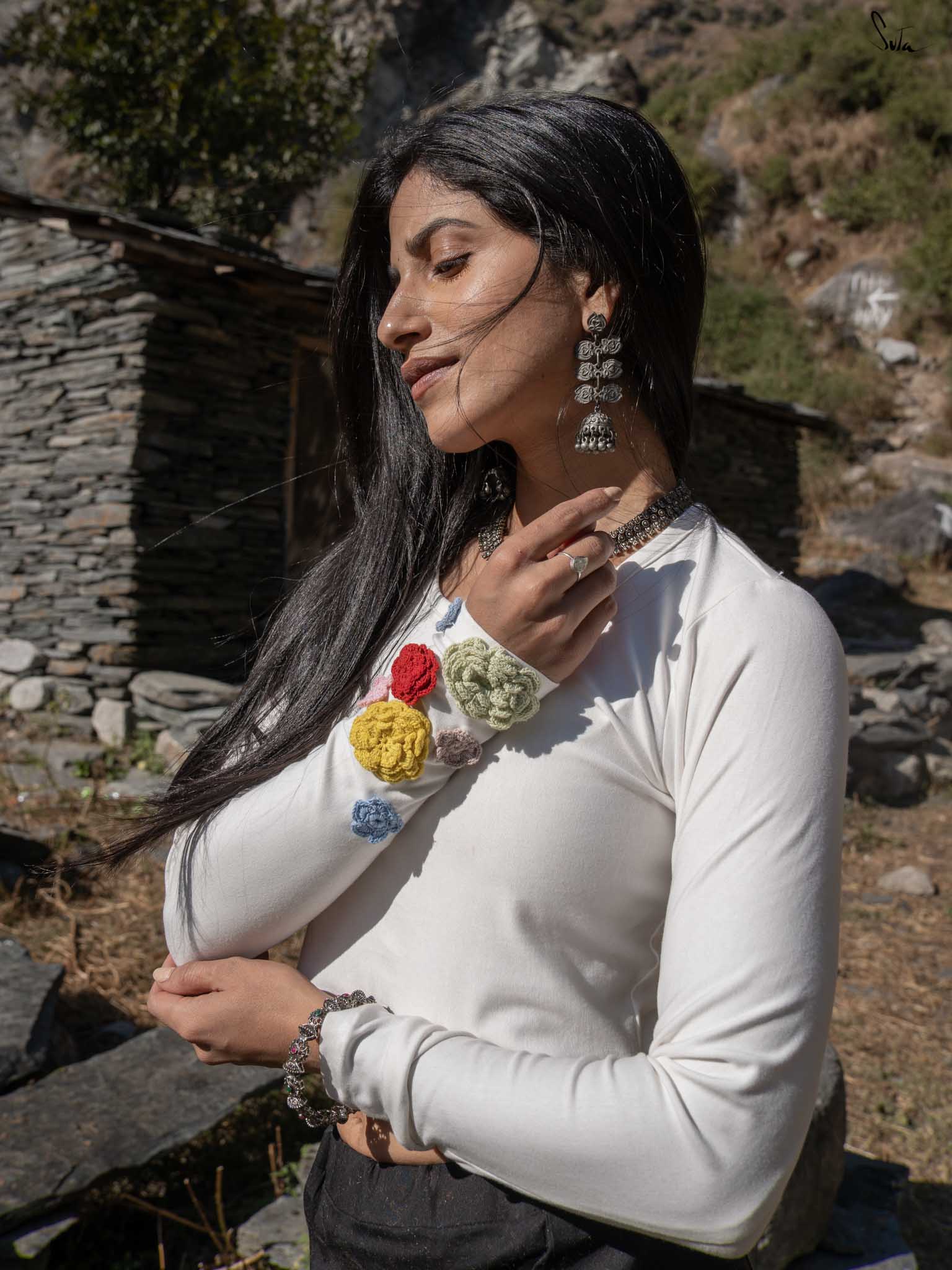 The clean round neckline and full sleeves give it a timeless appeal, while subtle crochet flower embellishments on the sleeves add a whisper of handcrafted charm. Pure, versatile, and endlessly wearable, it’s the blouse you’ll reach for again and again.
