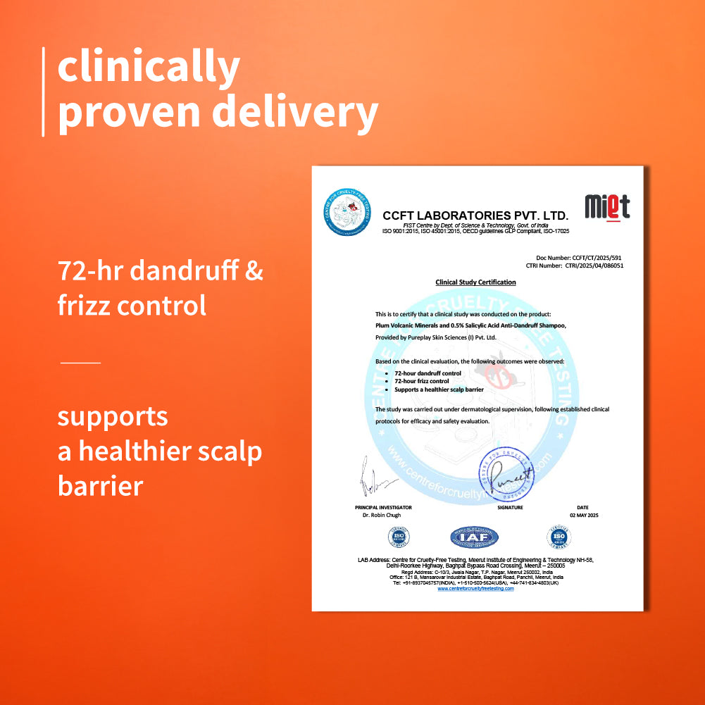 72-HR DANDRUFF & FRIZZ CONTROL: This high-performance anti dandruff clarifying shampoo combines 0.5% Salicylic Acid to gently exfoliate scalp buildup, loosen flakes, and clear clogged follicles, thereby tackling dandruff at the root. The protein-rich Amino Acid blend strengthens hair from within and smoothens cuticles, visibly reducing frizz and breakage. Because real results begin with smart chemistry.