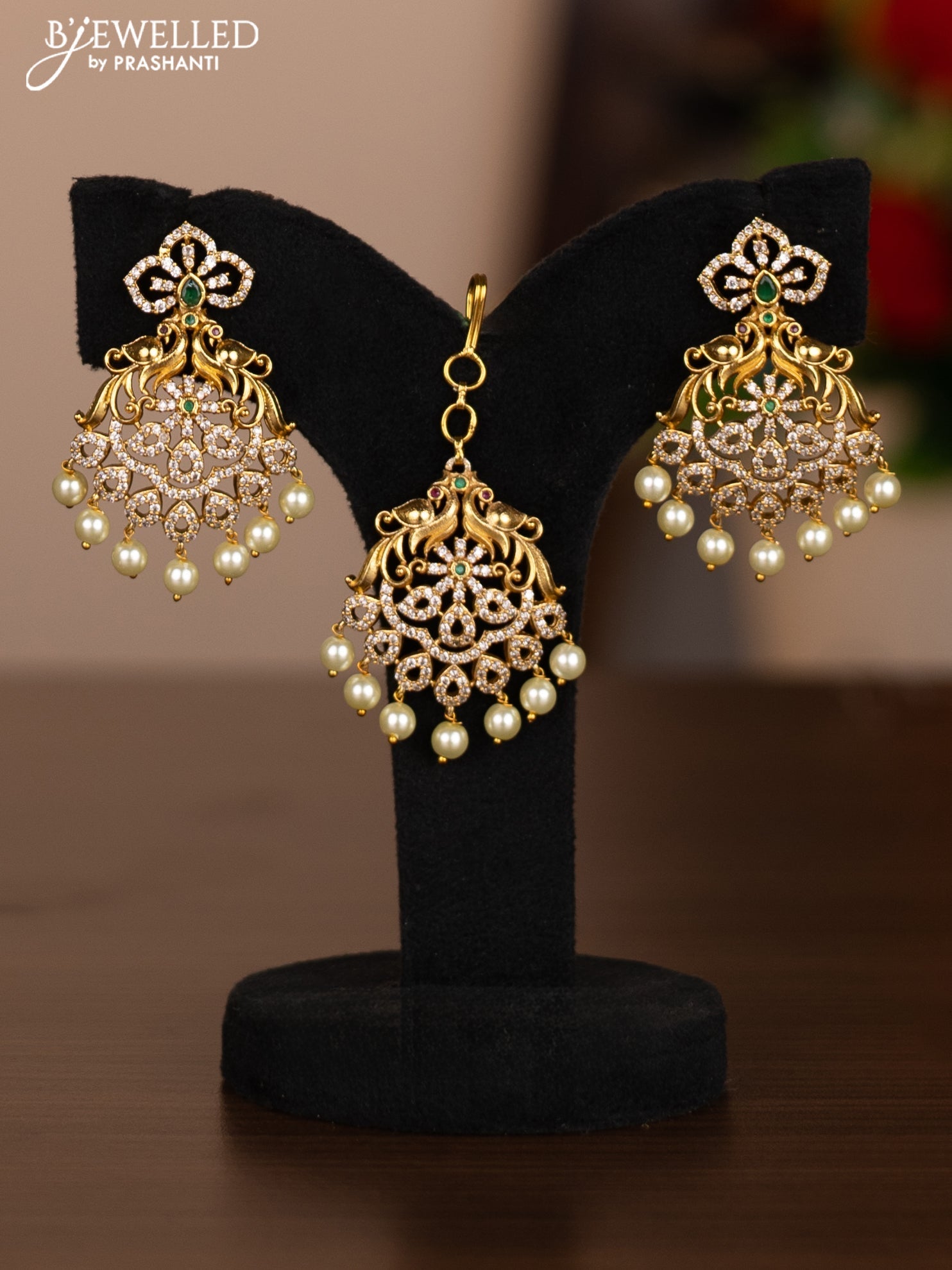 Antique combo set peacock & manga design with kemp & cz stones and pearl hangings