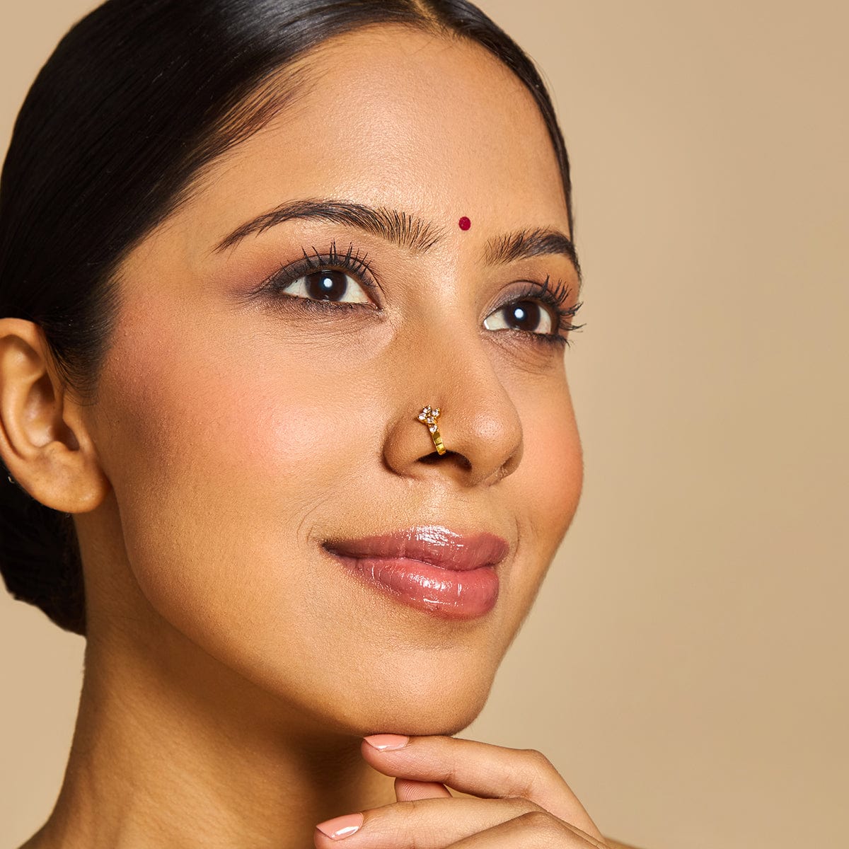 Antique Clip On NathSteal the spotlight with Kushal's antique nath. Featuring vibrant ruby or classic white stones and a chic gold polish, it’s designed to impress. Crafted from durable copper alloy with a secure pressing mechanism, this nath is both stylish and reliable. Perfect for adding a subtle yet sophisticated flair to any outfit.