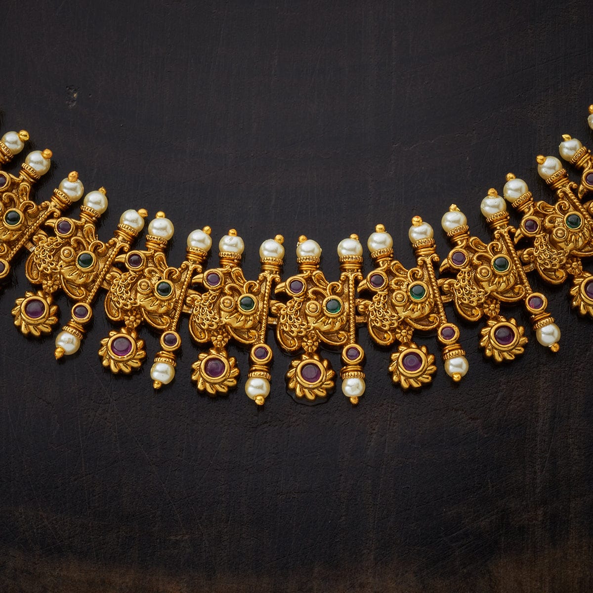 This gold-plated long necklace with jhumka earrings looks absolutely stunning. The jewellery set has an antique feel and will look great with ethnic outfits. The jhumkas have white pearl hangings that make it look very elegant. The traditional appearance of the jewellery set makes it perfect to be worn with saree and ghagra choli.