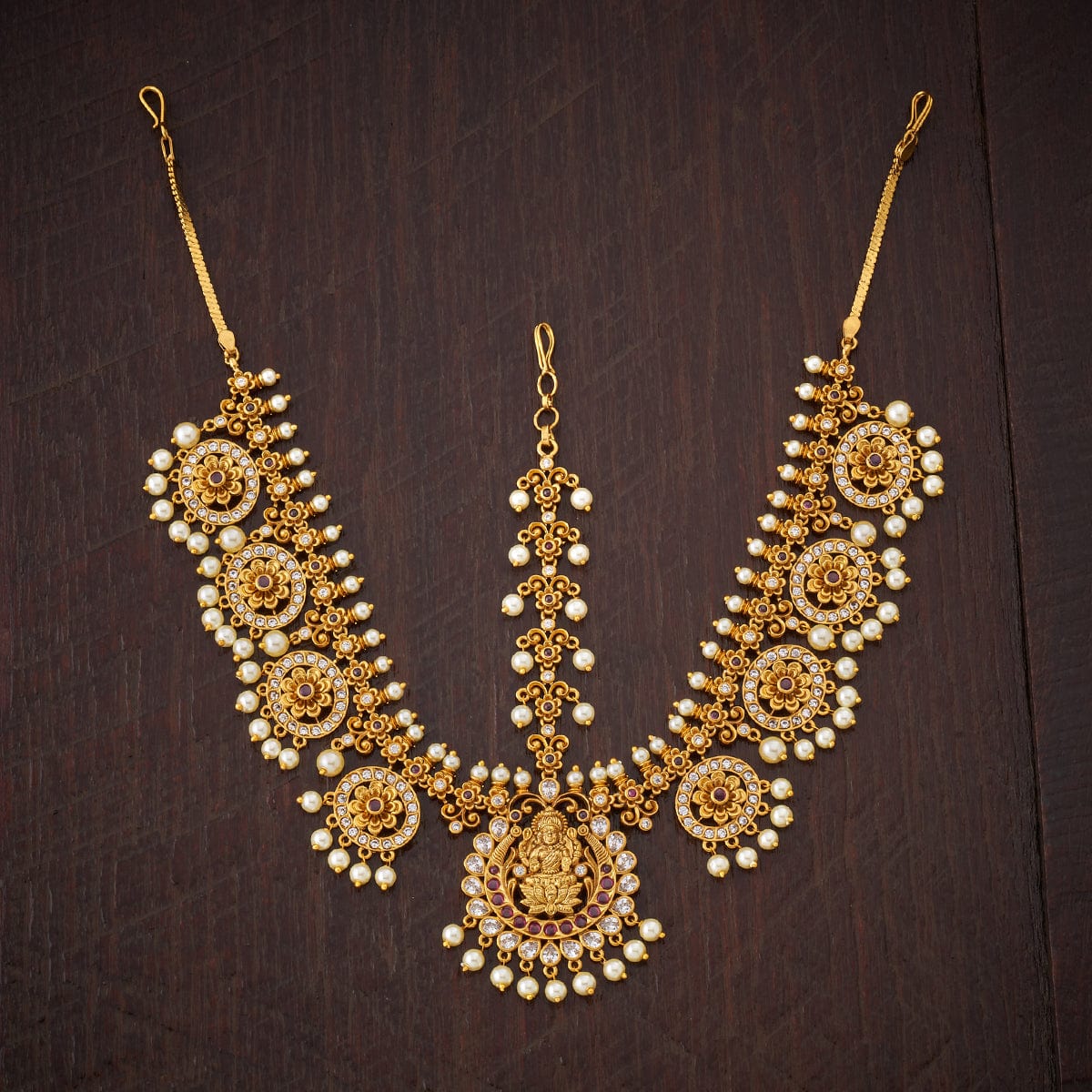 Feel all queenly as you style this mesmerizing bridal maang tikka from our collection. This jaw-dropping ruby beauty has a copper alloy base and a goddess Lakshmi design in the middle. This wholesome design is adorned with stones and beads in the most lavish way. This stunning beauty upswing your bridal attire like a spell!