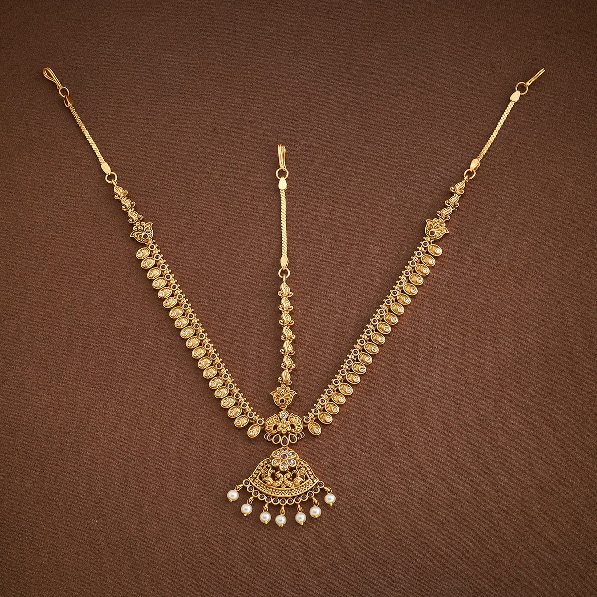 Upgrade your traditional look with this unique antique tikka from Kushal's Antique Jewellery Collection, a beautiful piece crafted from copper alloy and adorned with vibrant ruby-coloured synthetic stones and beads. The tikka is lightweight and finished in a classic gold polish for a timeless appeal.
