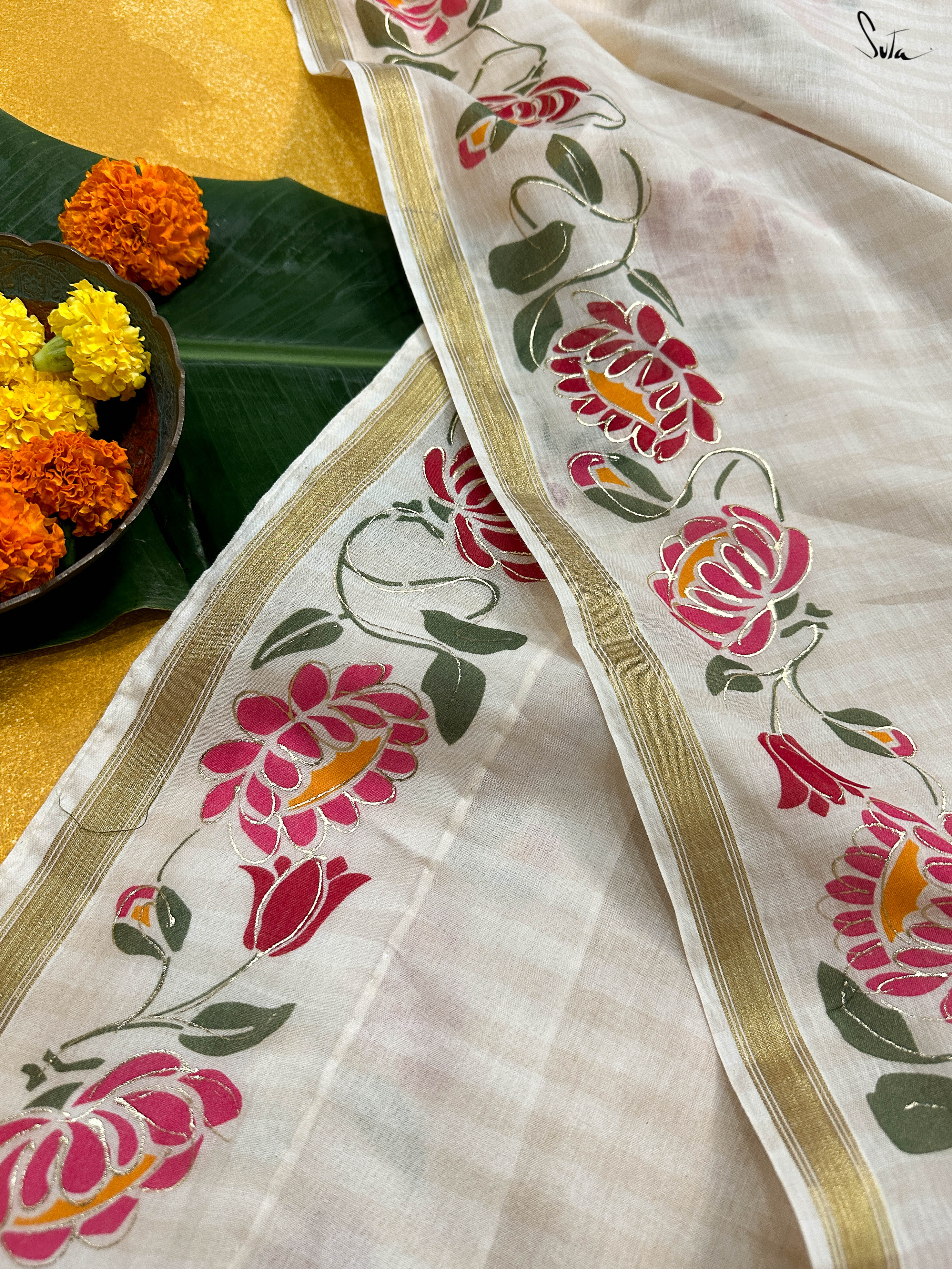 Arali is crafted from a cotton viscose blend, embodying the essence of a flower garden.  This off-white saree drapes beautifully and a classic gold zari border adds a touch of regal opulence.