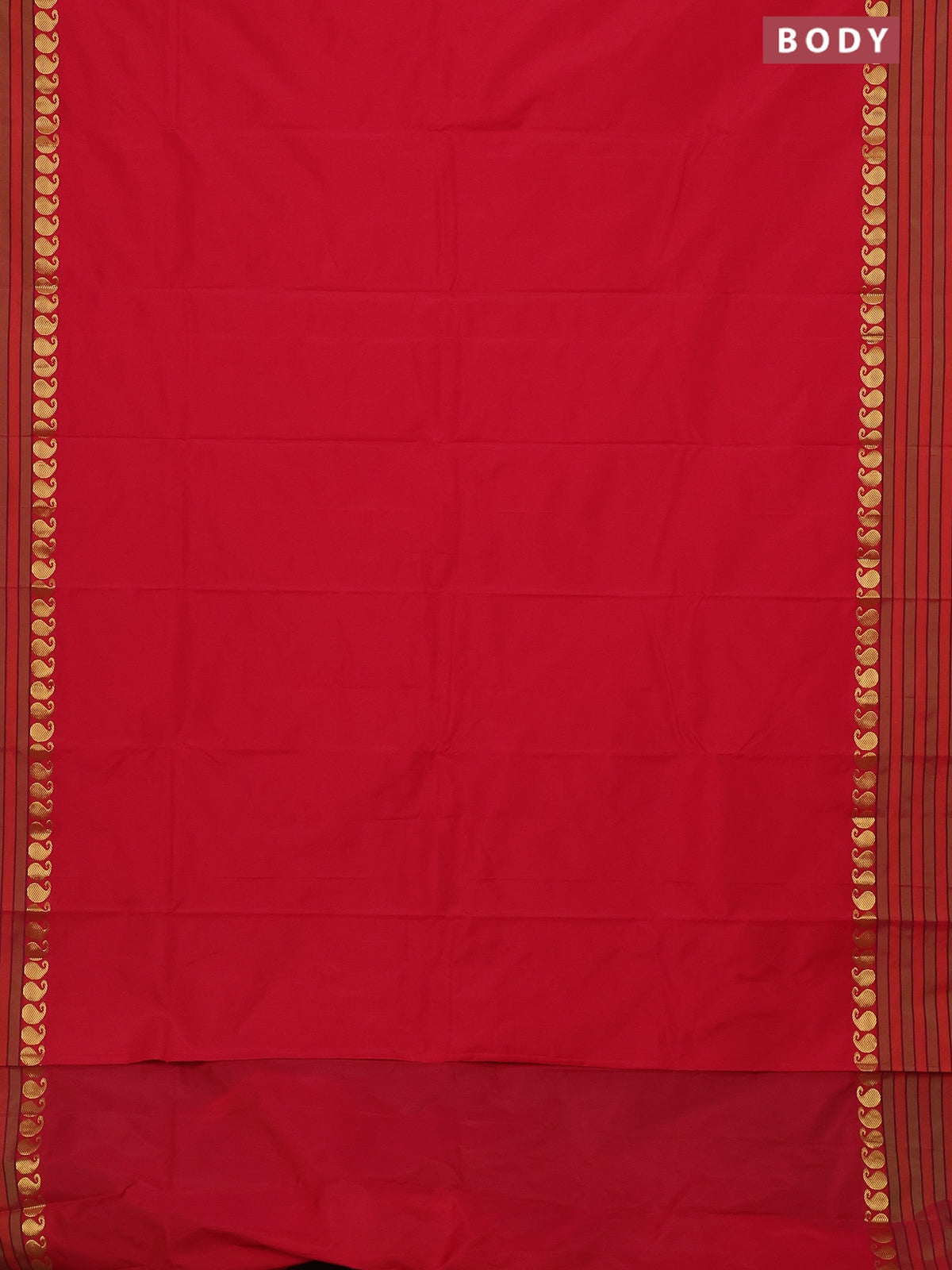 Arani semi silk saree red and light green with plain body and paisley zari woven simple border