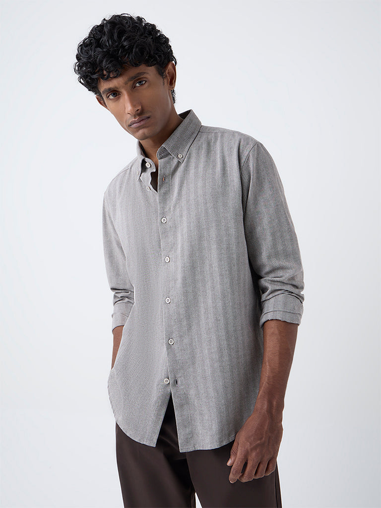 Balancing classic design with contemporary ease, this taupe shirt from Ascot is tailored from a cotton-blend fabric in a relaxed silhouette. The chevron patterns lend a refined texture, while the button-down collar and full sleeves complete its smart yet laid-back appeal.