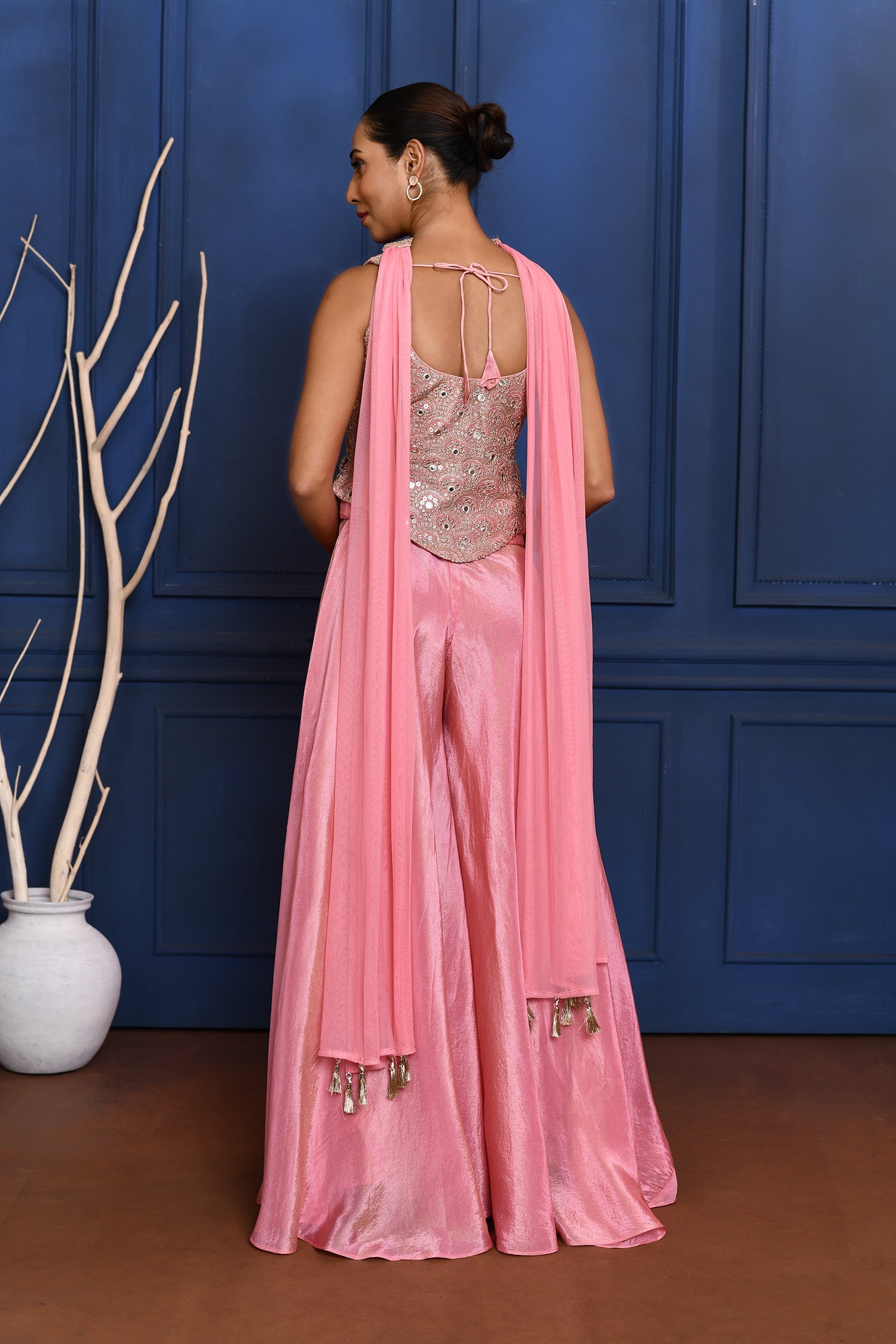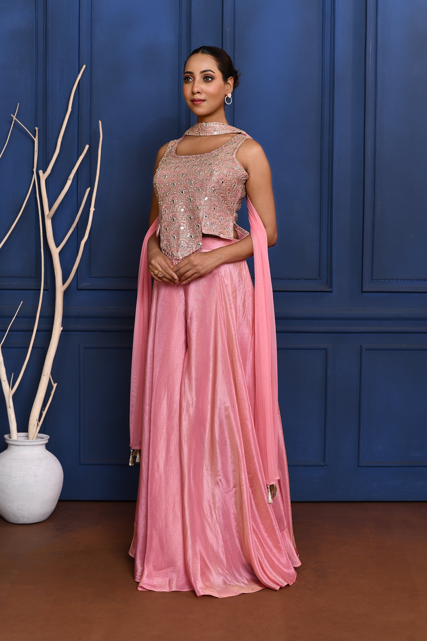 The baby pink tissue indo-western set with embroidered top and matching plain palazzo with dupatta for a stylish way of dressing with elegance.