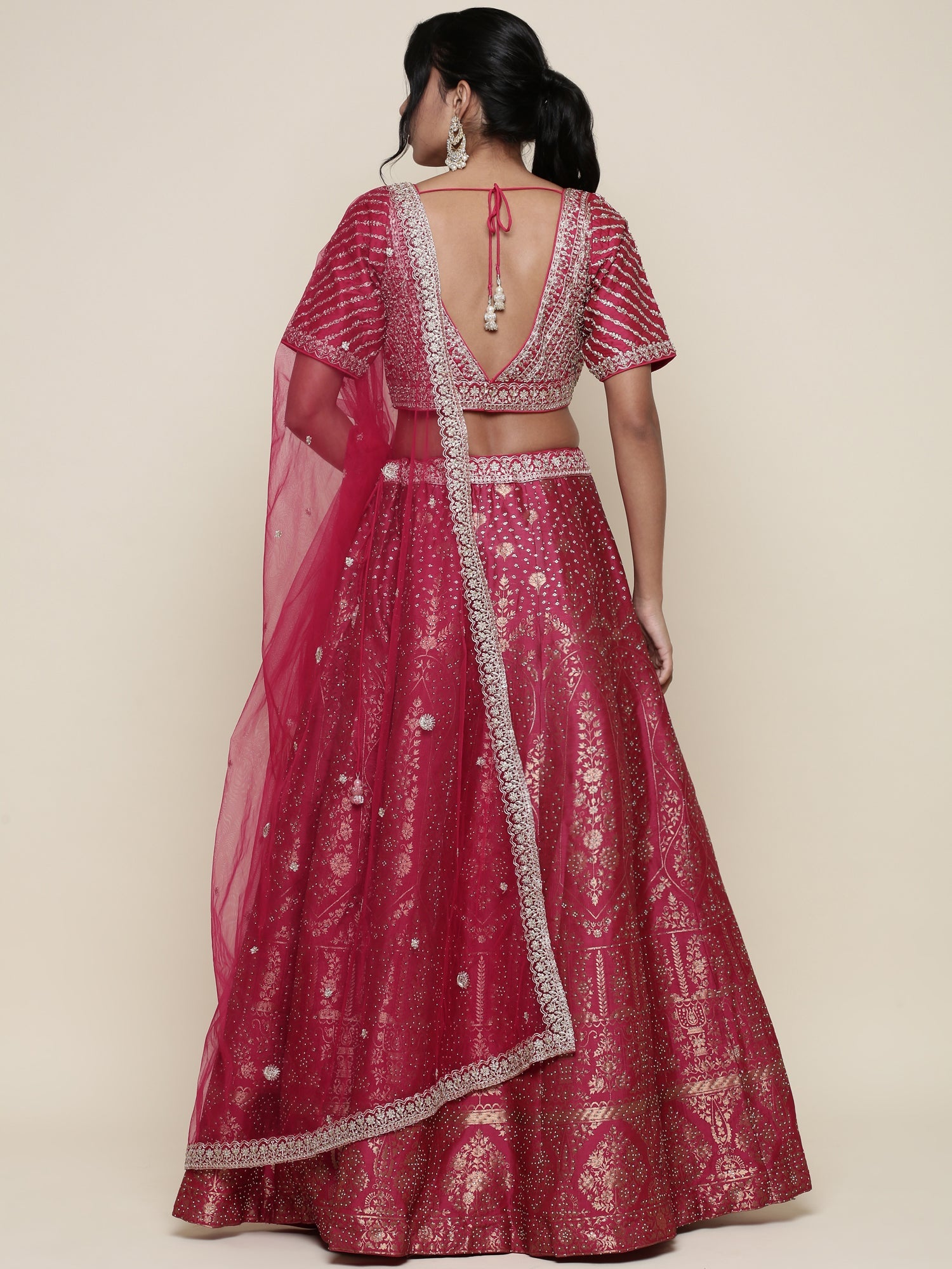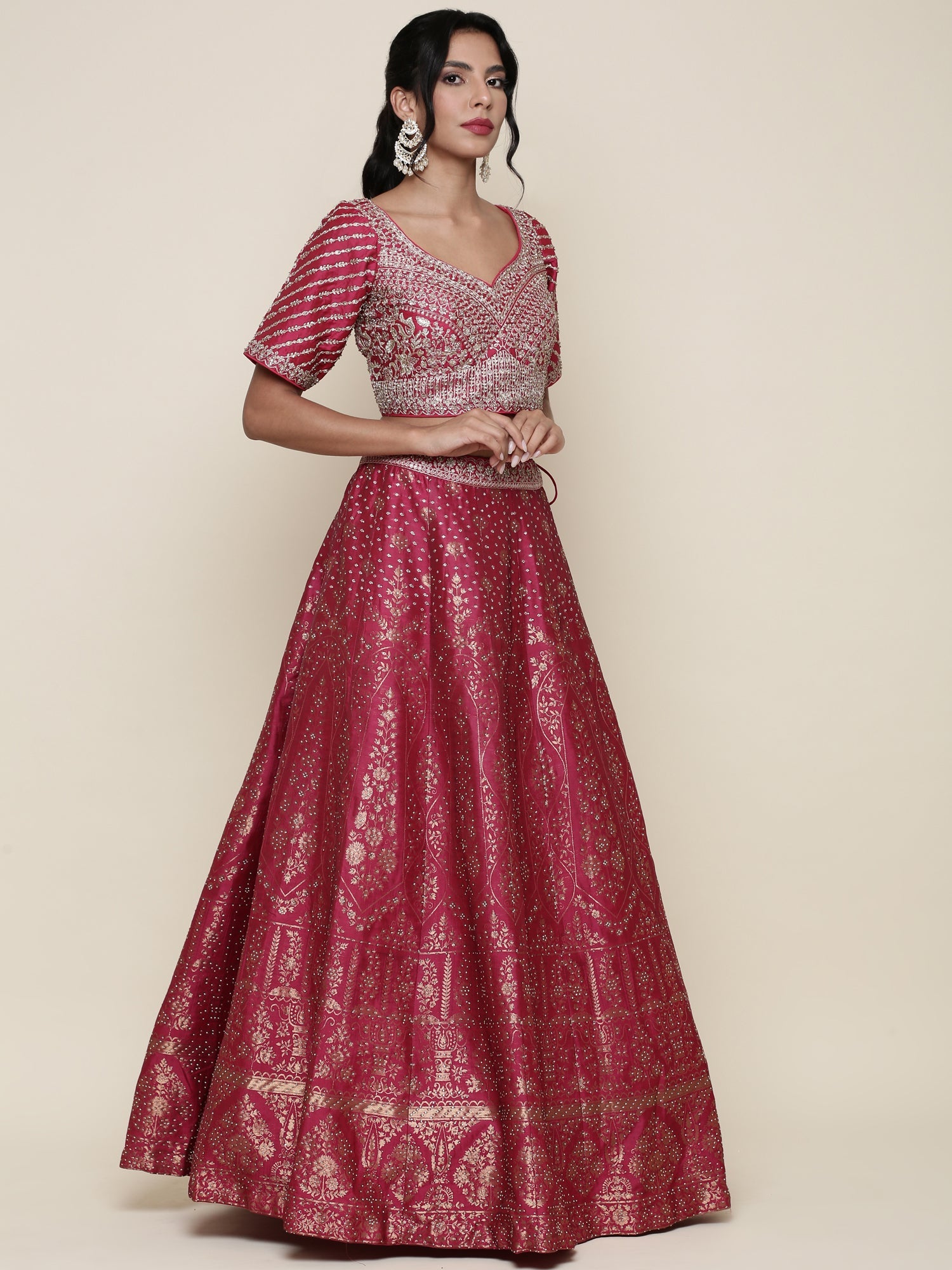 Experience the timeless elegance of our Banaras pink embroidered three-piece ghagra set. Crafted with intricate embroidery on rich fabric, this ensemble combines traditional craftsmanship with contemporary style. The coordinated skirt, blouse, and dupatta offer a harmonious look perfect for festive occasions and weddings, ensuring both comfort and sophistication. Elevate your ethnic wardrobe with this expertly designed set that reflects cultural heritage and impeccable artistry.