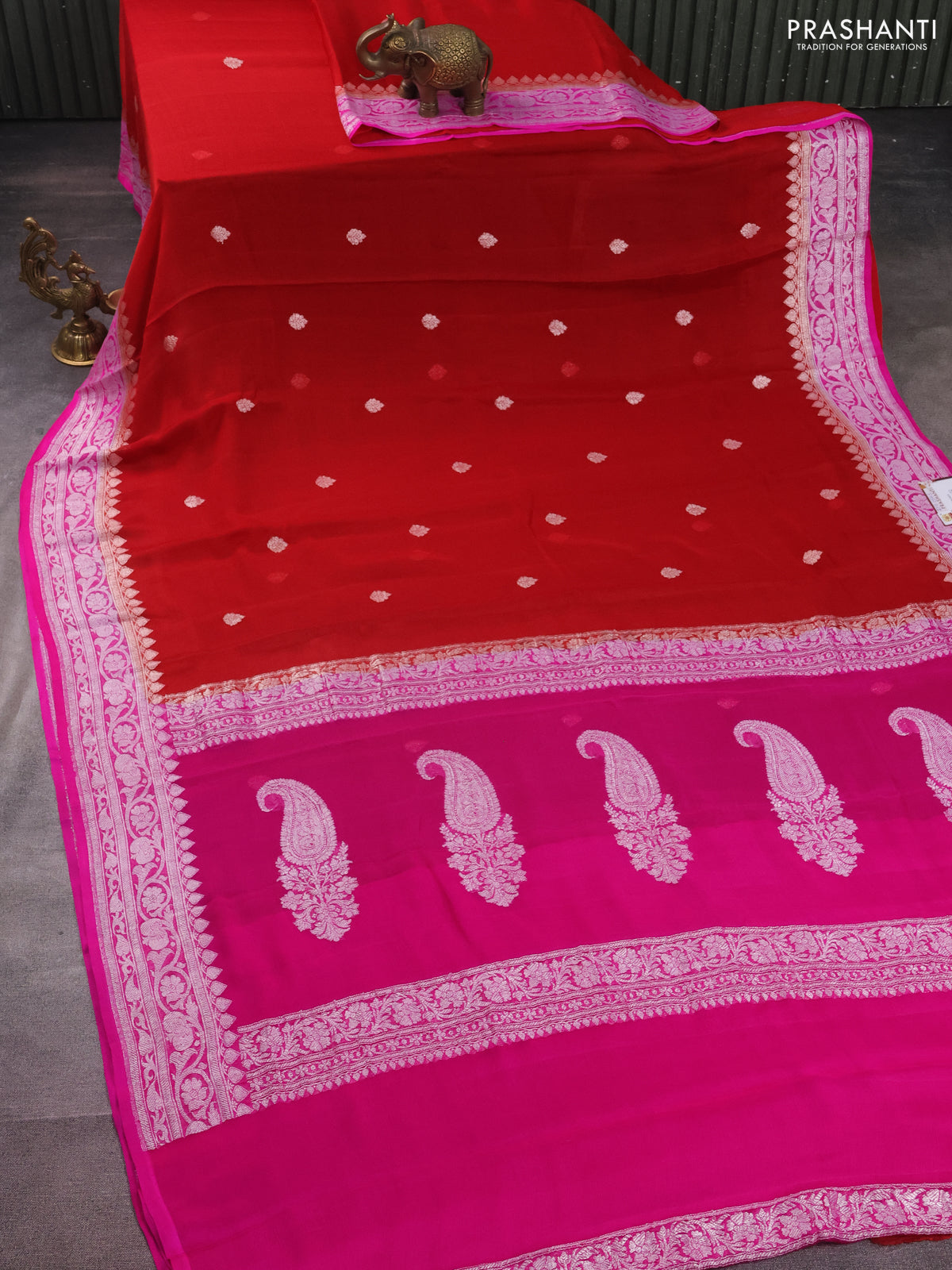 Banarasi chiffon silk saree red and pink with silver zari woven buttas and silver zari woven border