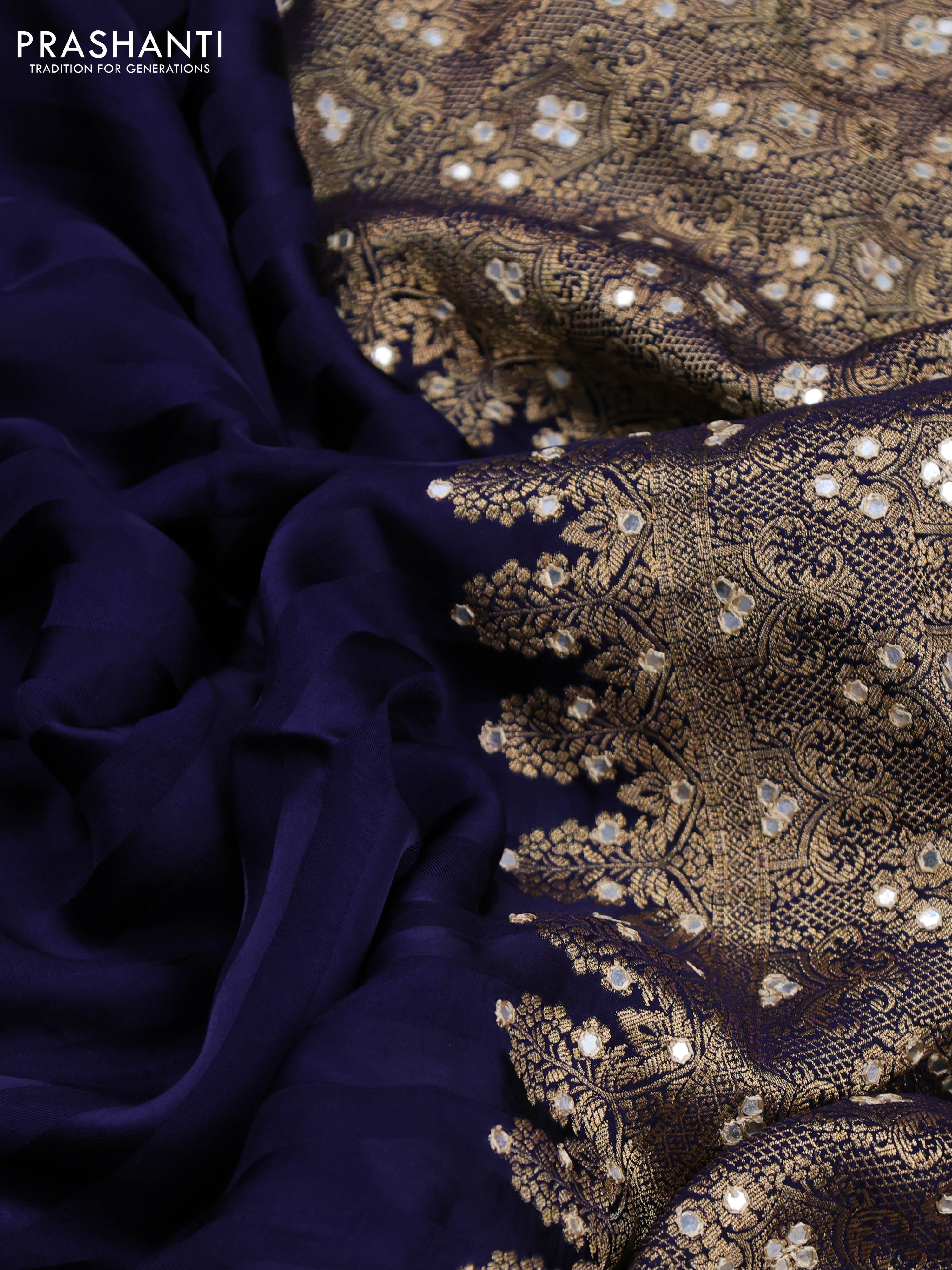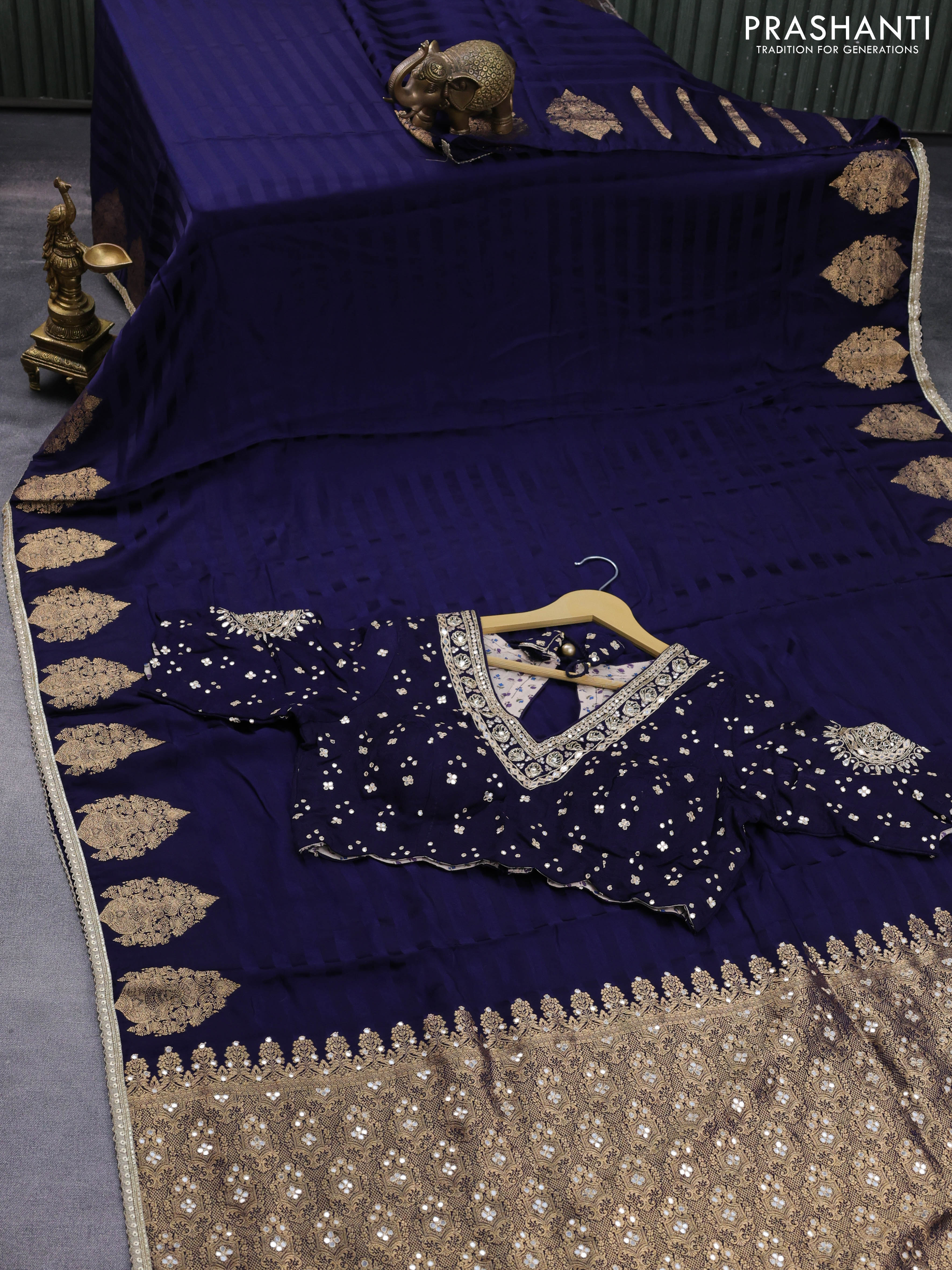 Banarasi crepe saree dark blue with stripes pattern and mirror work & banarasi style border