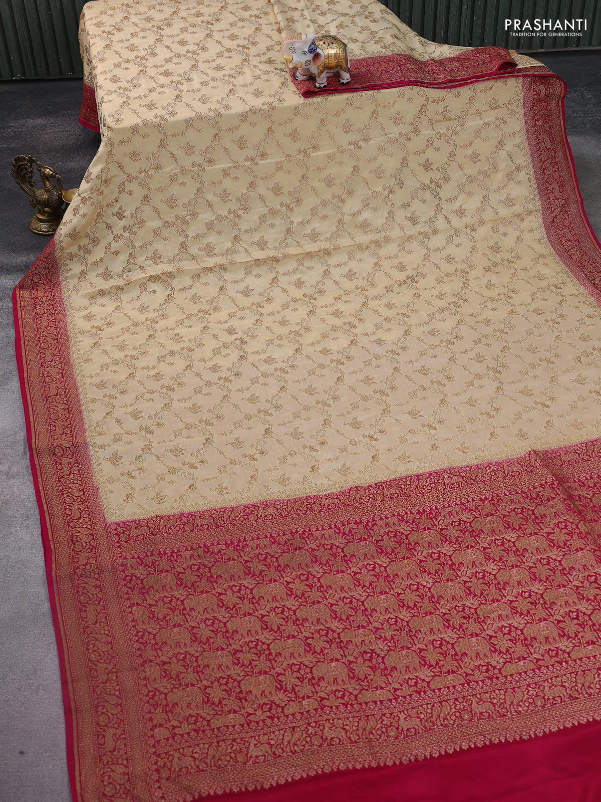 Banarasi crepe saree sandal and pink with allover thread & zari weaves and woven border