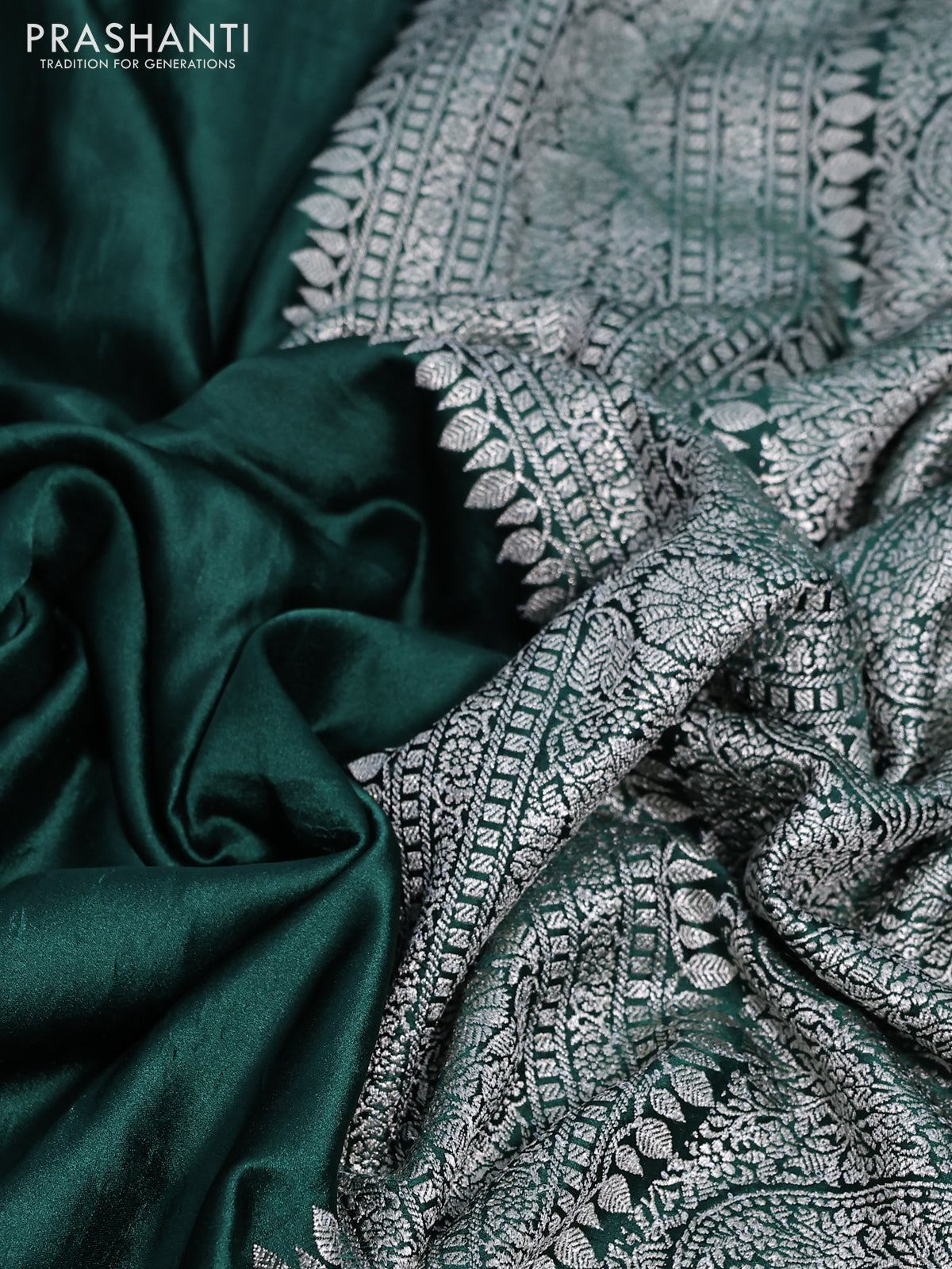 Banarasi crush crepe saree dark green with plain body and zari woven border