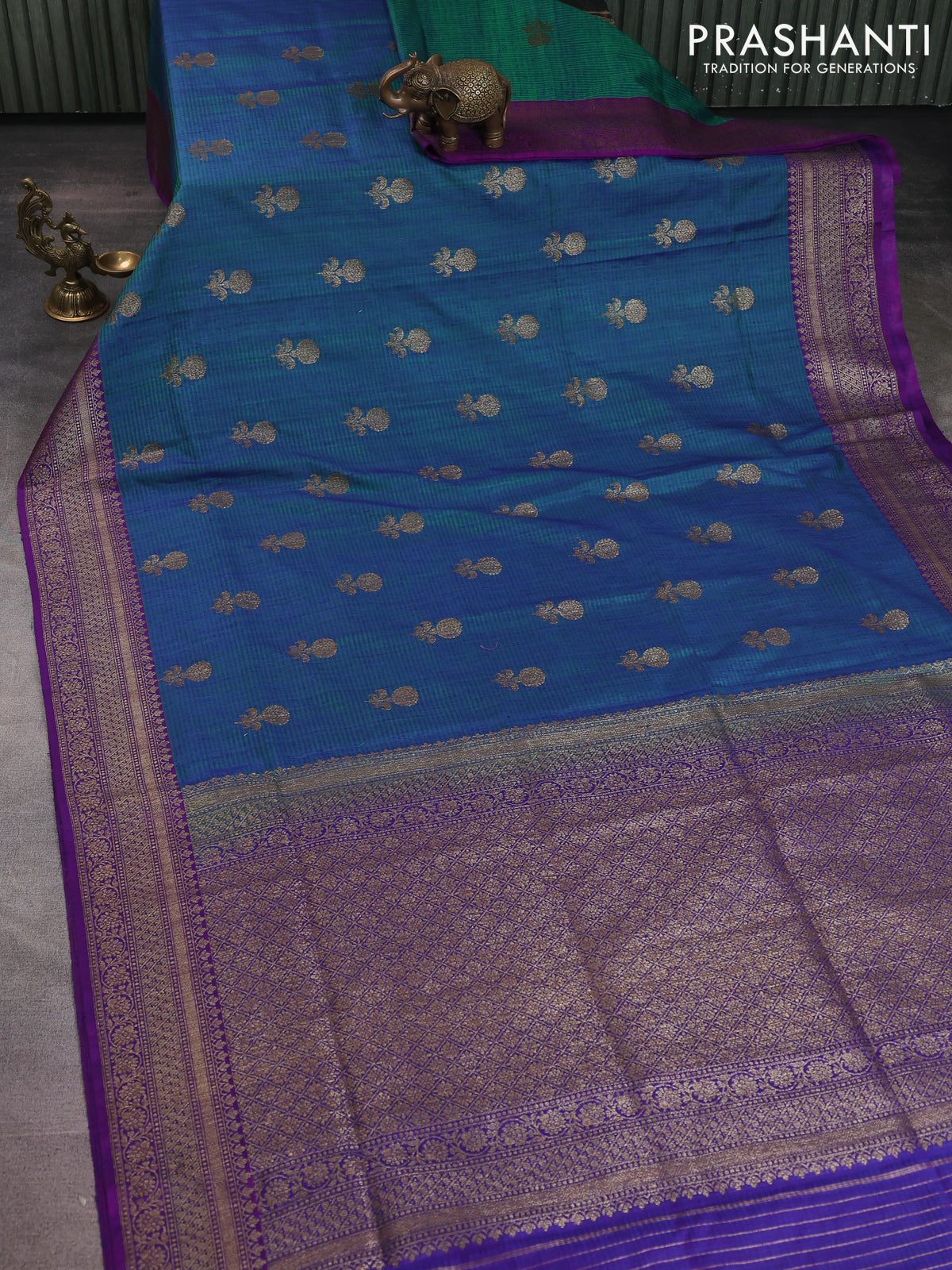 Banarasi dupion silk saree dual shade of bluish green and purple with thread & zari woven buttas and woven border