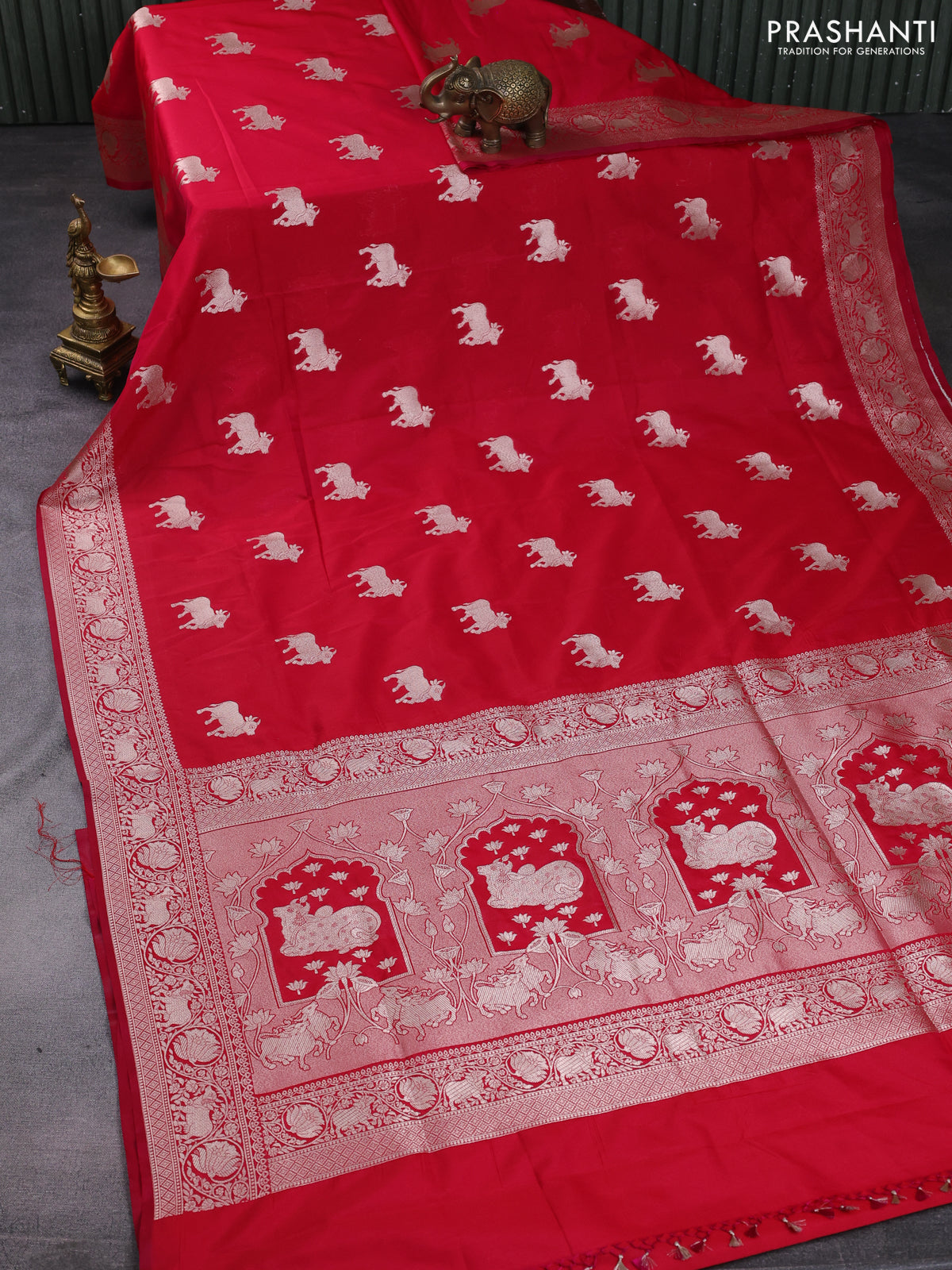 Banarasi semi katan saree reddish pink with zari woven buttas and zari woven border