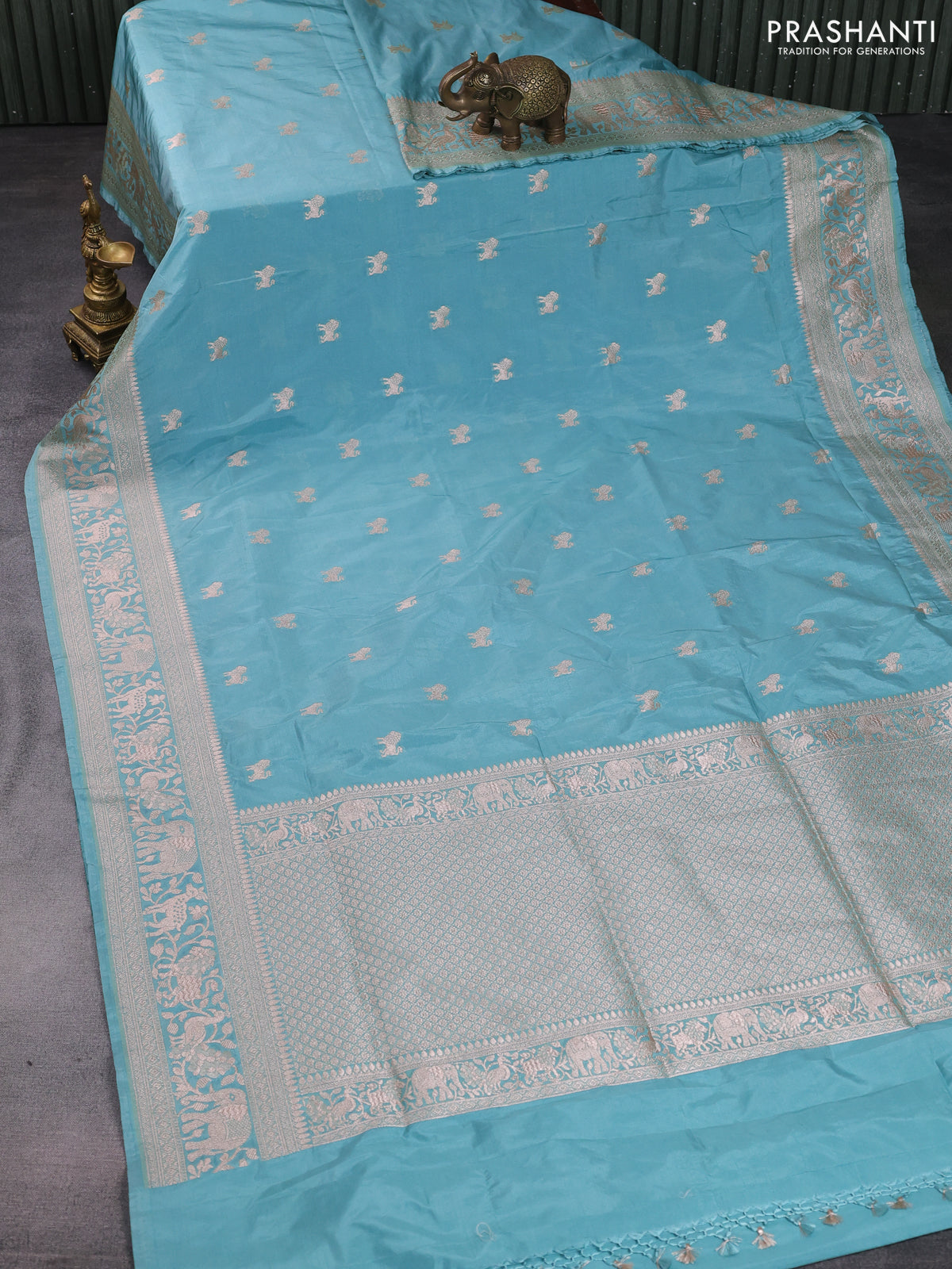 Banarasi semi katan saree teal blue with lion zari woven buttas and rich zari woven butta border