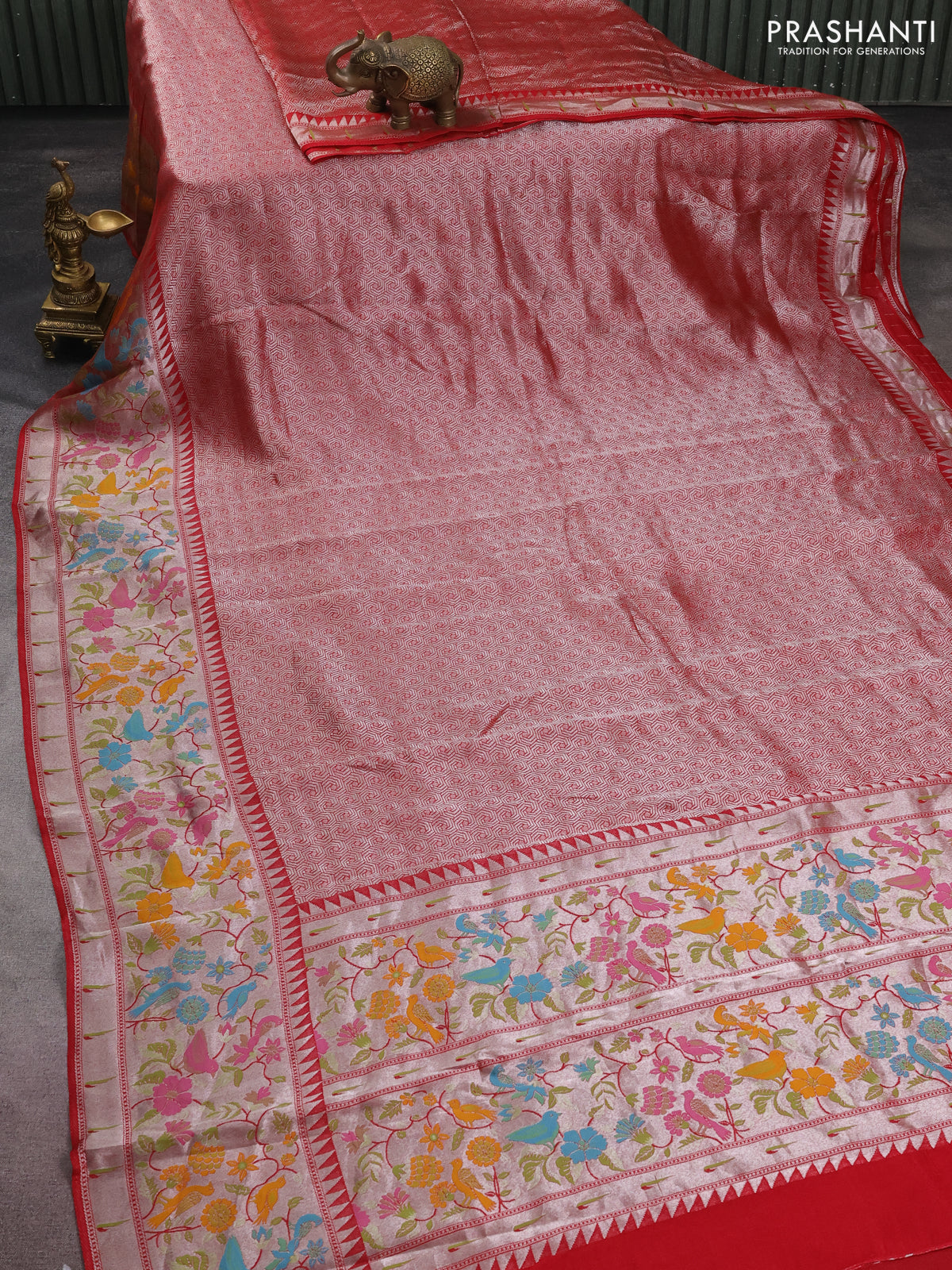 Banarasi semi raw silk saree red with allover silver woven brocade weaves and floral design paithani border