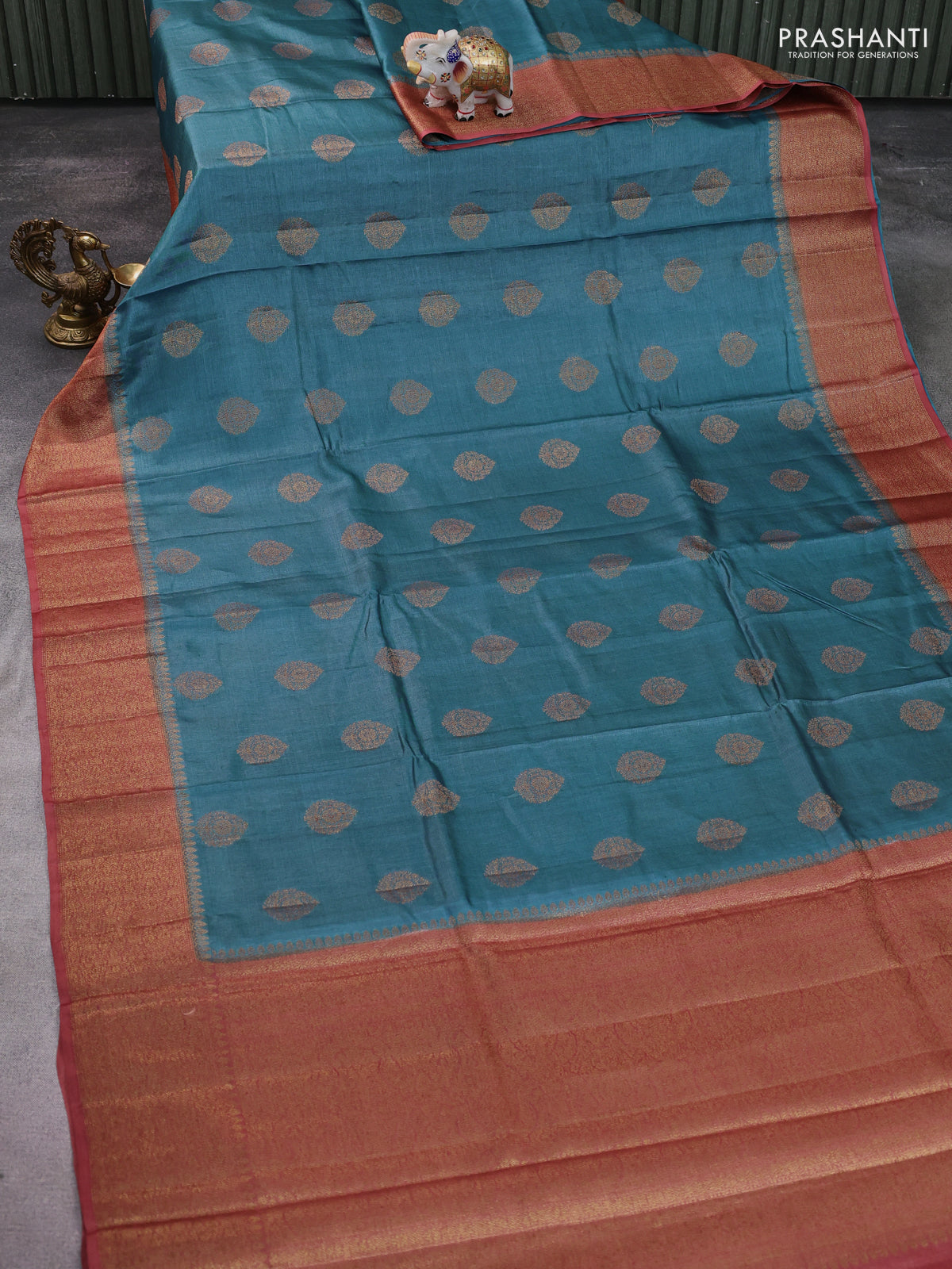 Banarasi tussar silk saree cs blue and rust shade with allover thread & zari woven buttas and woven border