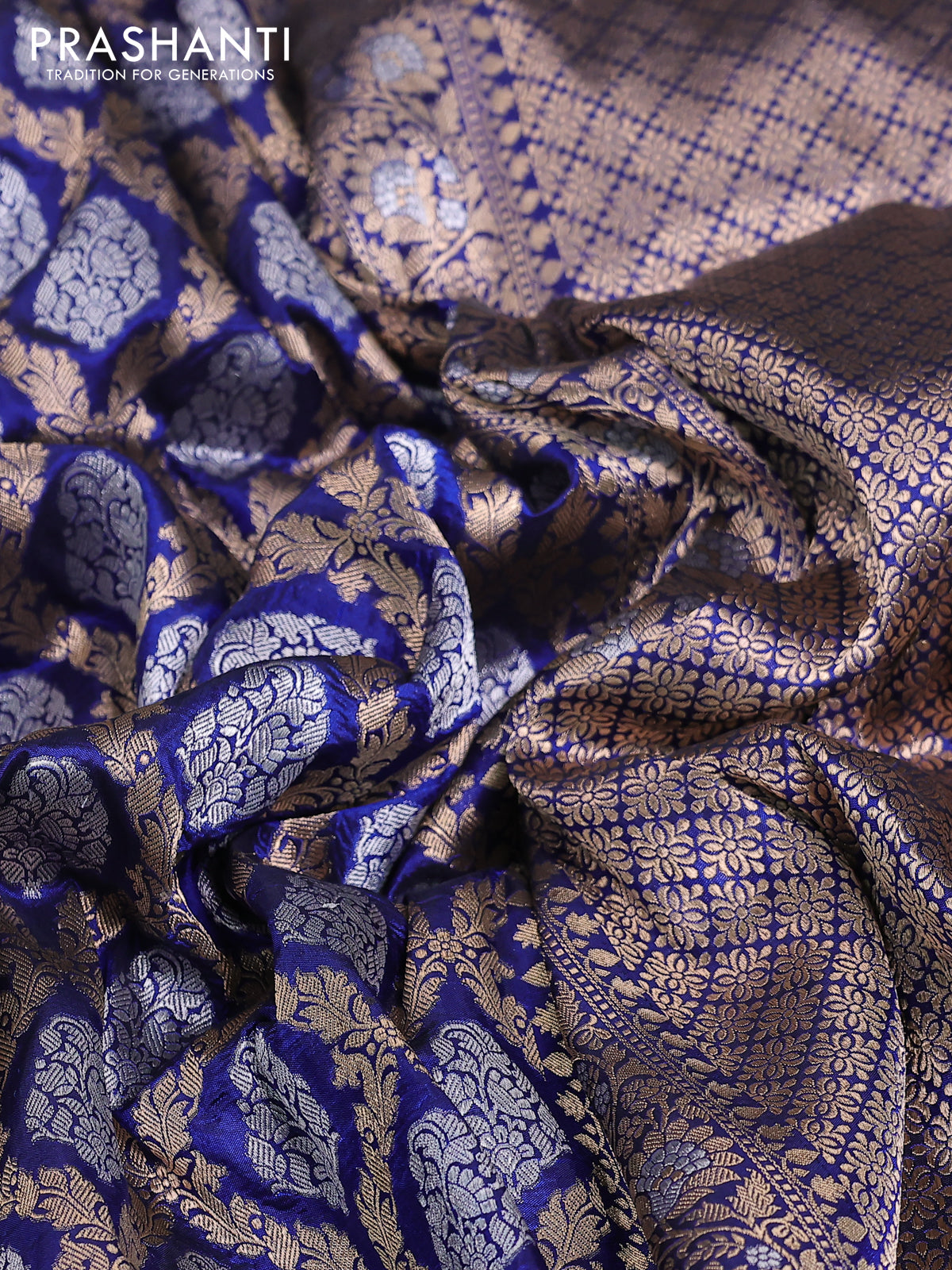 Banarasi uppada silk saree blue with allover silver & gold zari woven brocade weaves and zari woven border