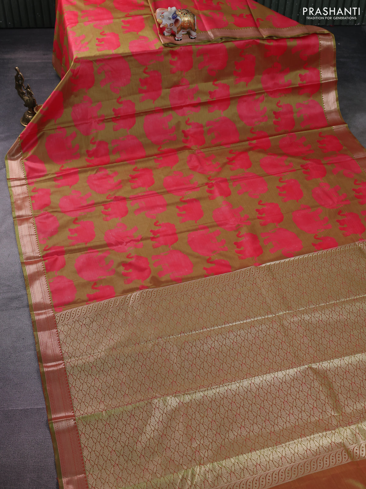 Bangalori semi silk saree lime green and pink with allover elephant butta ikat weaves and zari woven border