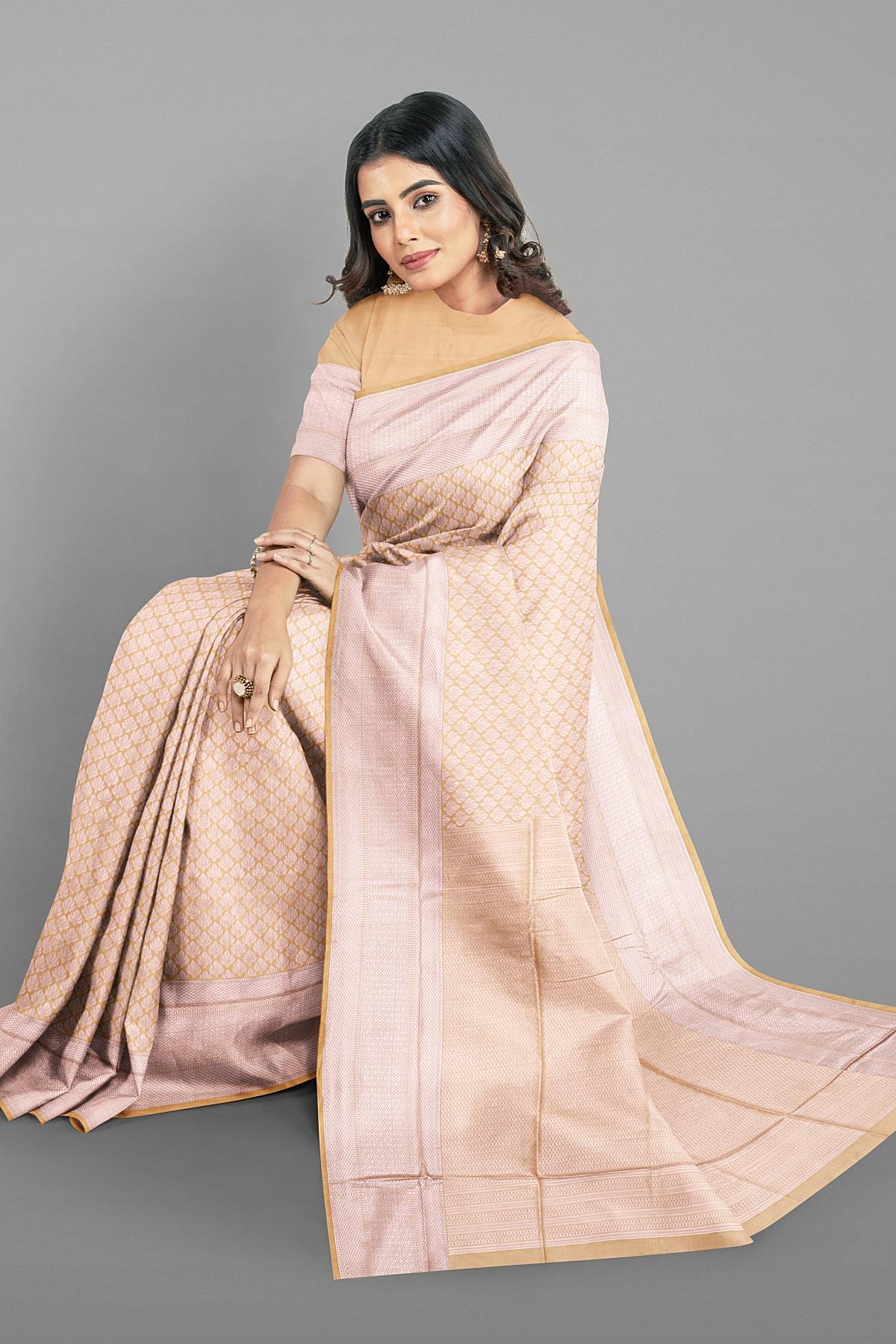 Latest BEIGE FLORALS SILK BLEND Saree with SELF ZARI border. This saree comes with PLAIN WITH BORDER SILK BLEND blouse.
