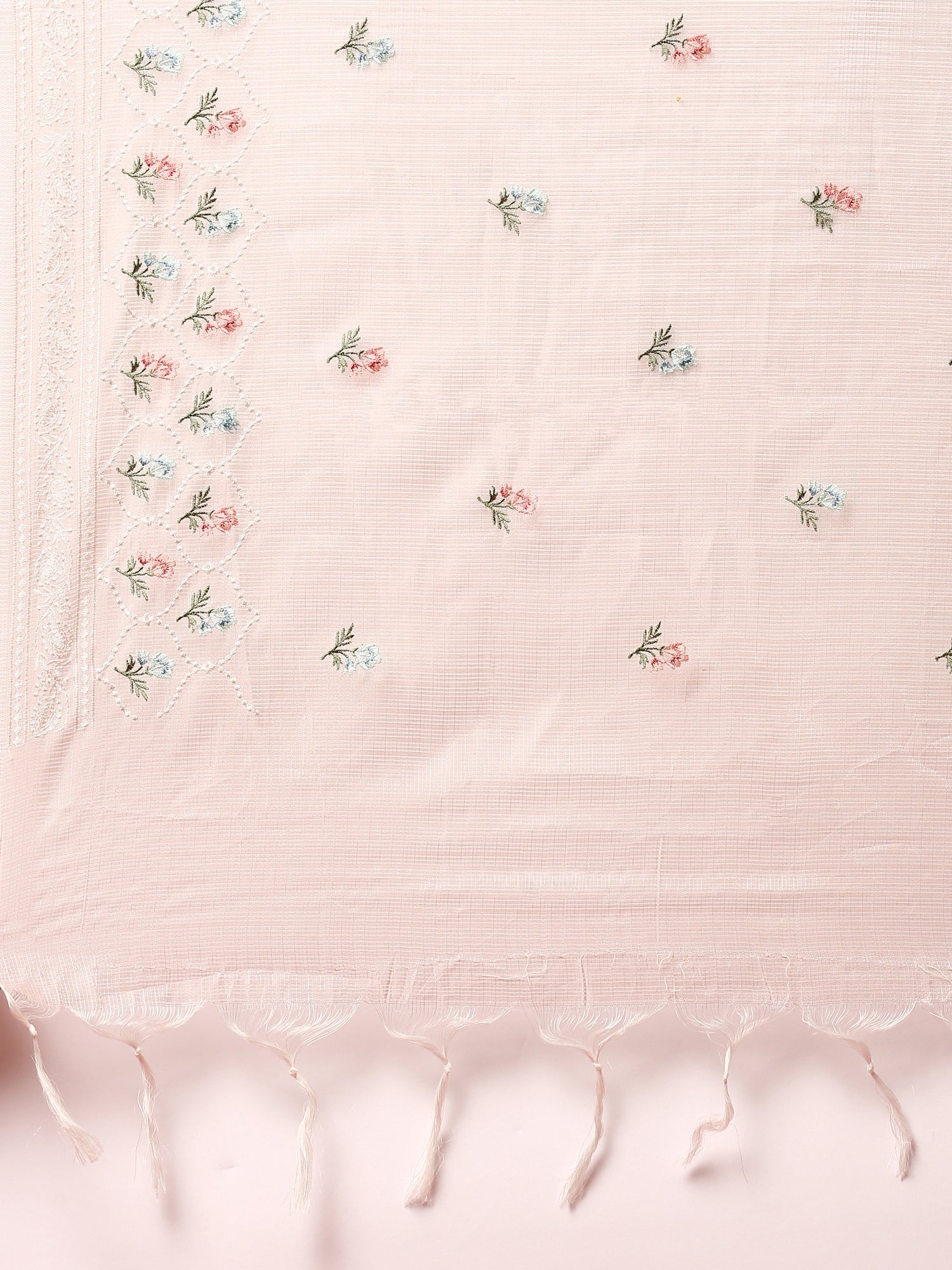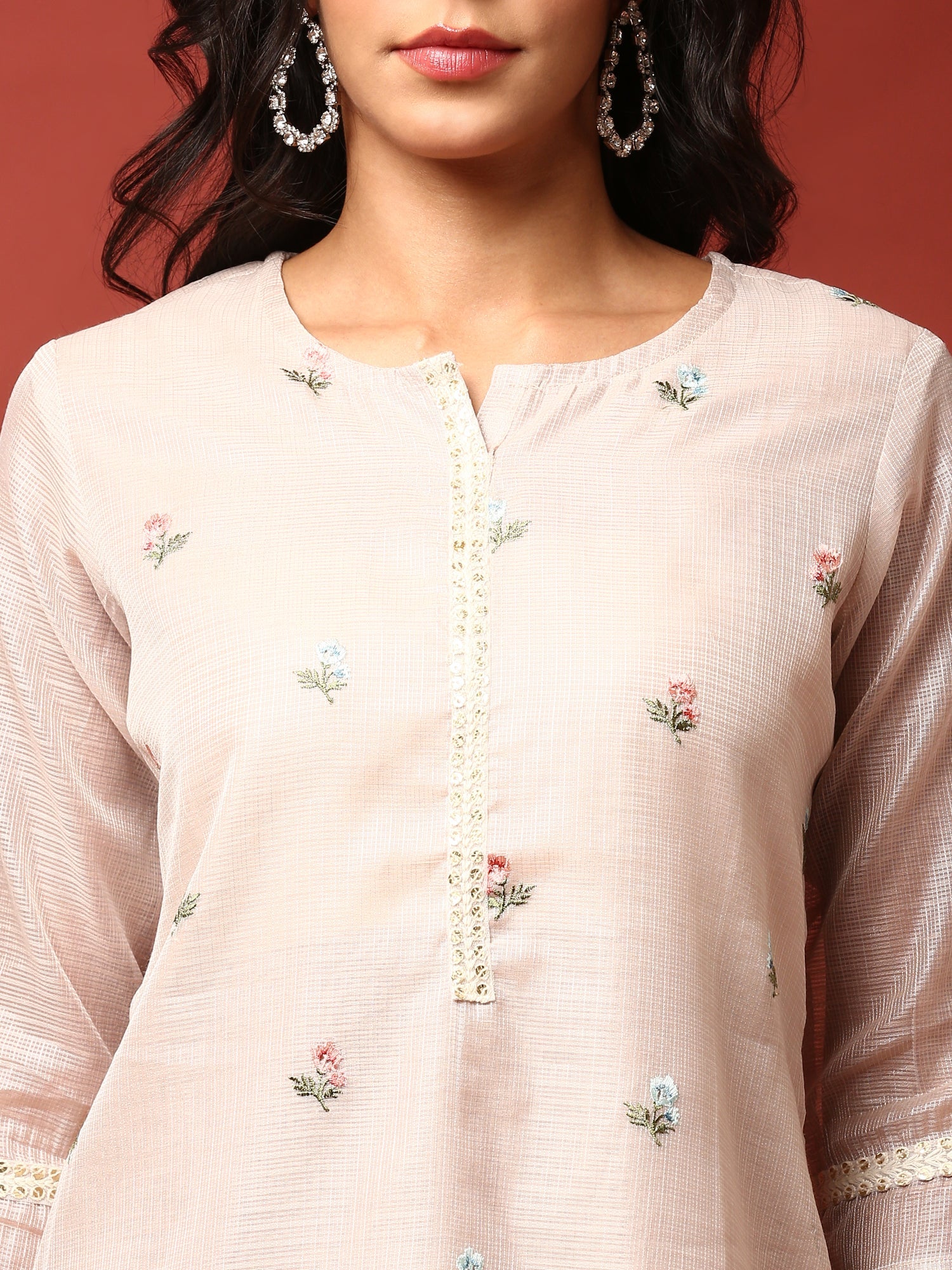 Elevate your ethnic wardrobe with this Beige Chanderi three-piece suit set, featuring exquisite thread work embroidery. Crafted from lightweight, breathable Chanderi fabric, it offers comfort without compromising elegance. Perfect for festive occasions or formal gatherings, this set combines timeless tradition with graceful style, ensuring you stand out effortlessly. Enjoy the blend of luxury and comfort in one beautifully embroidered ensemble.