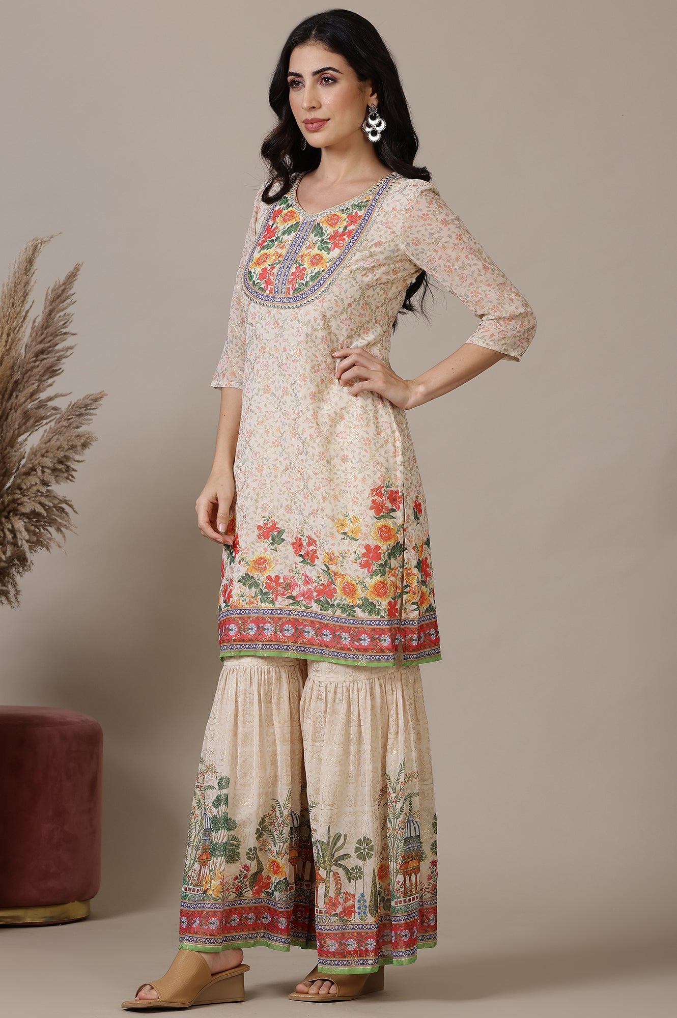 Beige Floral Printed Mirrir Work Short Kurta and Sharara Set with Dupatta
