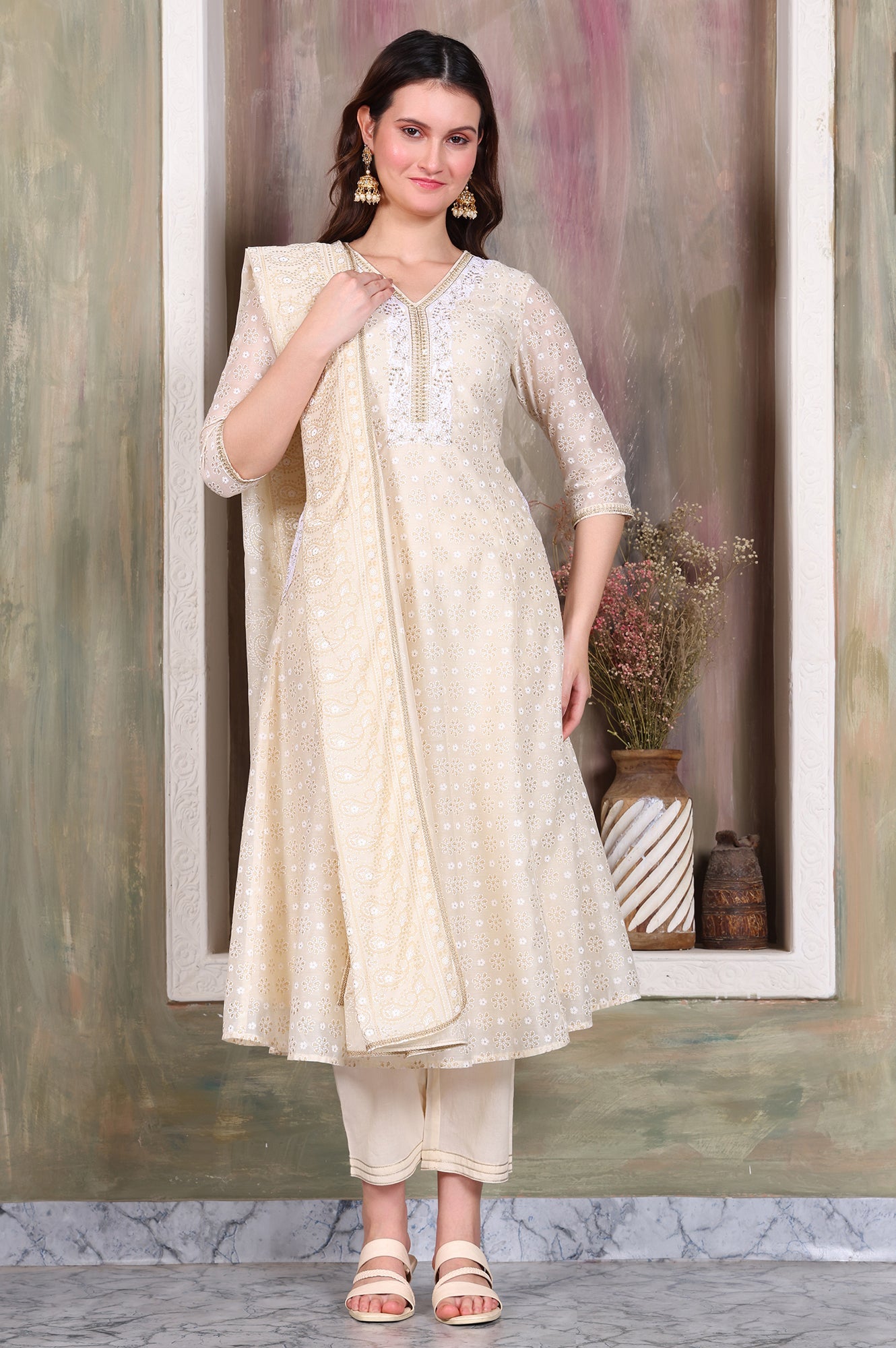 Beige Foil Printed Sequinned A-Line Kurta, Pant and Stole Set