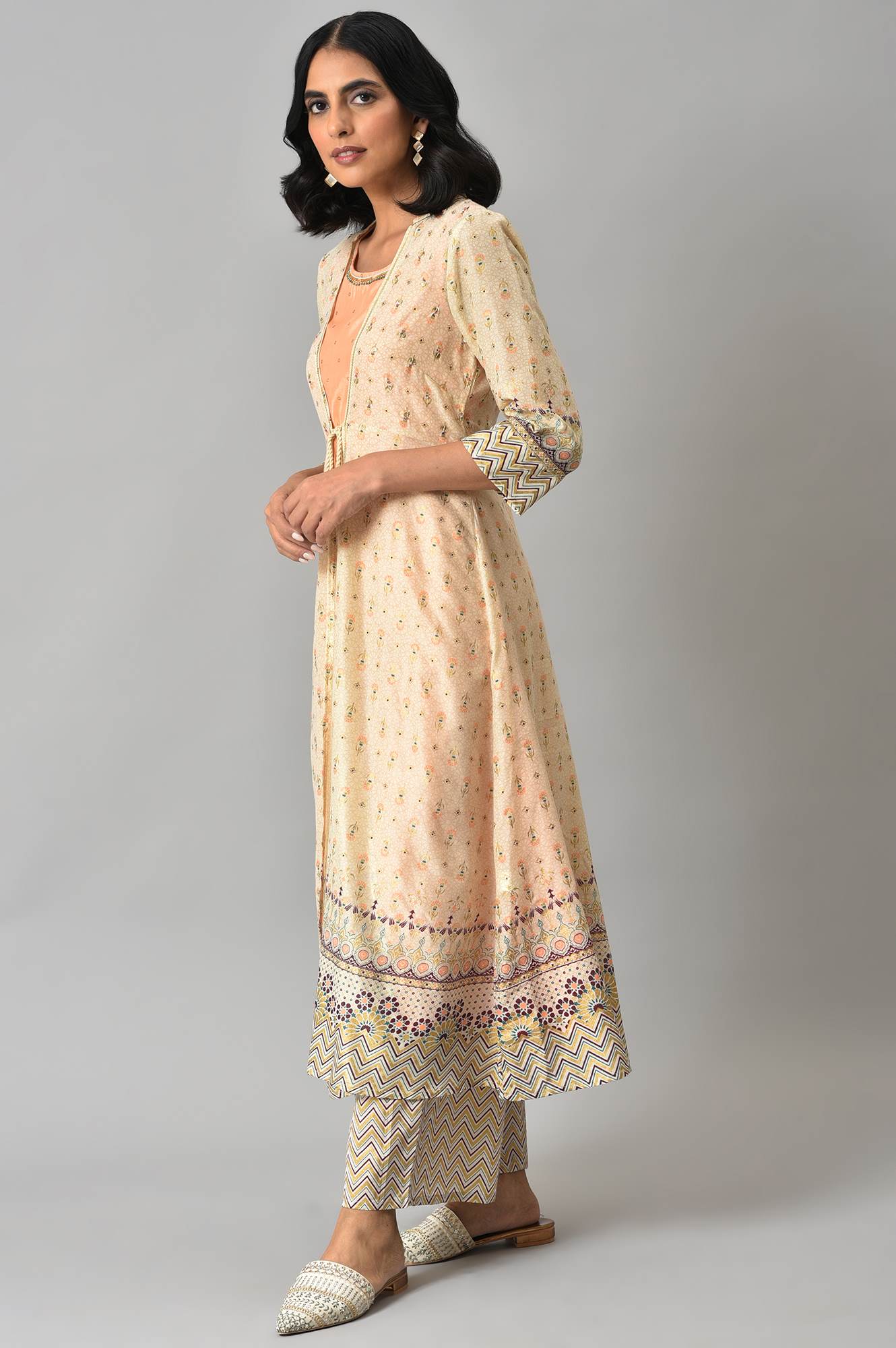 Beige Printed Front Open Gilet With Peach Inner Kurta And And Beige Straight Palazzo
