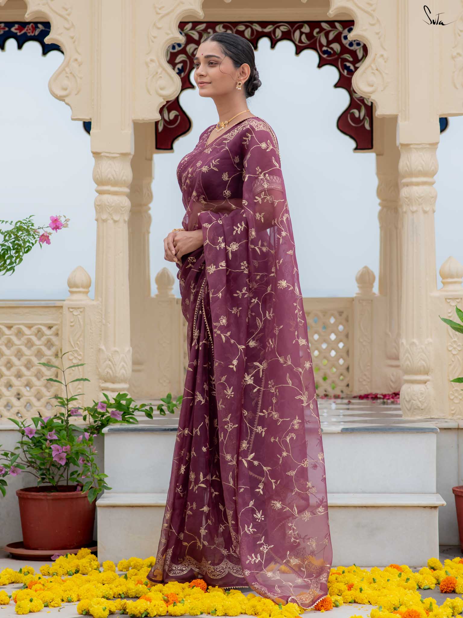 Make every celebration sparkle with Berry Foil, a sheer, lightweight organza saree in elegant mauve. Delicate golden foil prints shimmer across the drape, complemented by intricate scallop-edge detailing for a refined, chic finish.