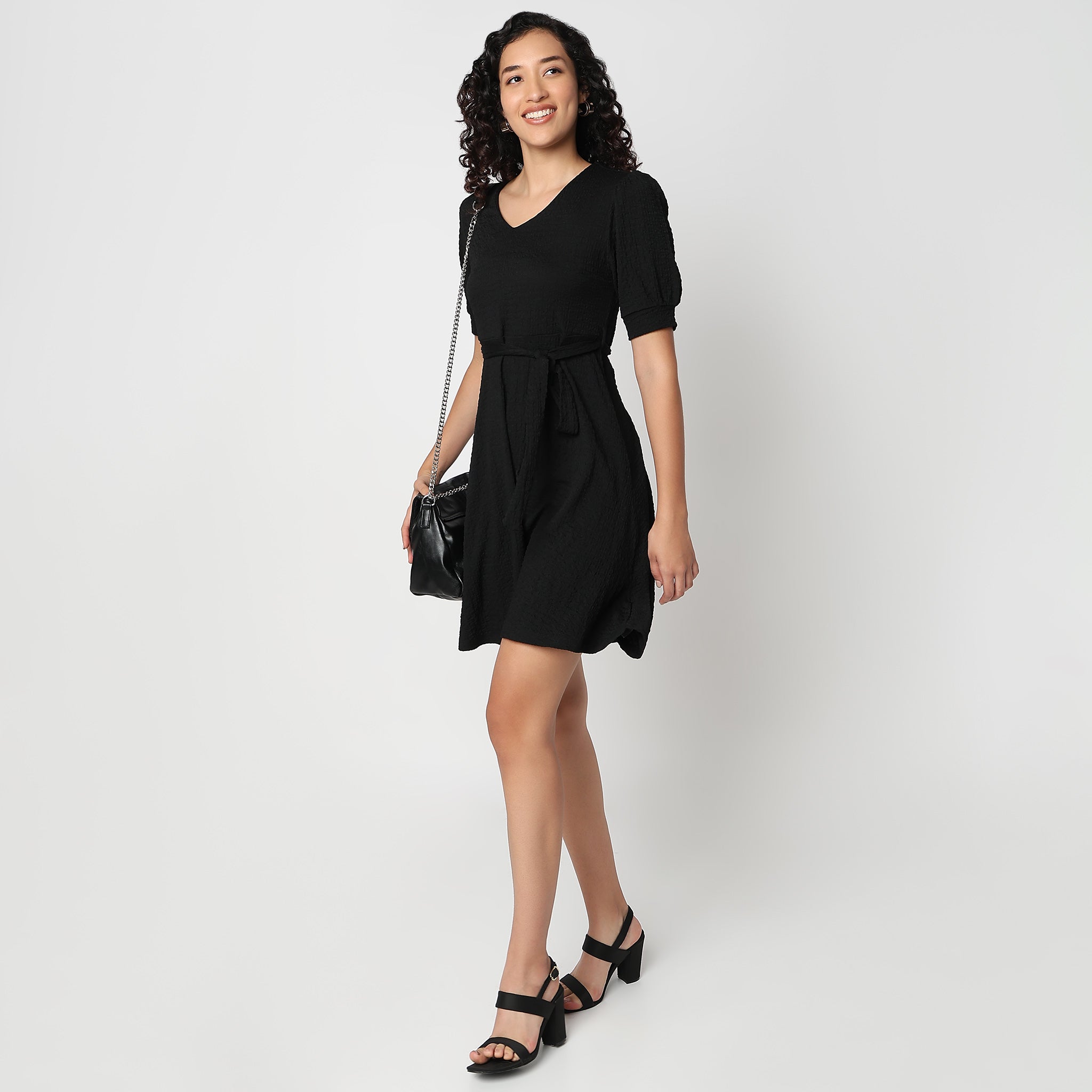 Betty V-Neck Short Dress With Belt Detail At Waist