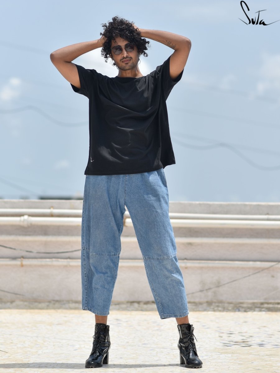 These statement tee-shirts are made of 100 per cent recycled fabric – 40 per cent is recycled from waste plastic bottles and 60 per cent from cotton textile waste. The plastic bottles are shredded into chips, which are then melted to extract polyester. The pre-consumer textile waste from mills is repurposed by separating the cotton scraps by colour. The scraps are then converted into recycled cotton fibre. Both these fibres are fused together to create a fibre that’s 100 per cent recycled. The fibre is spun into yarn, which is then woven into fabric.