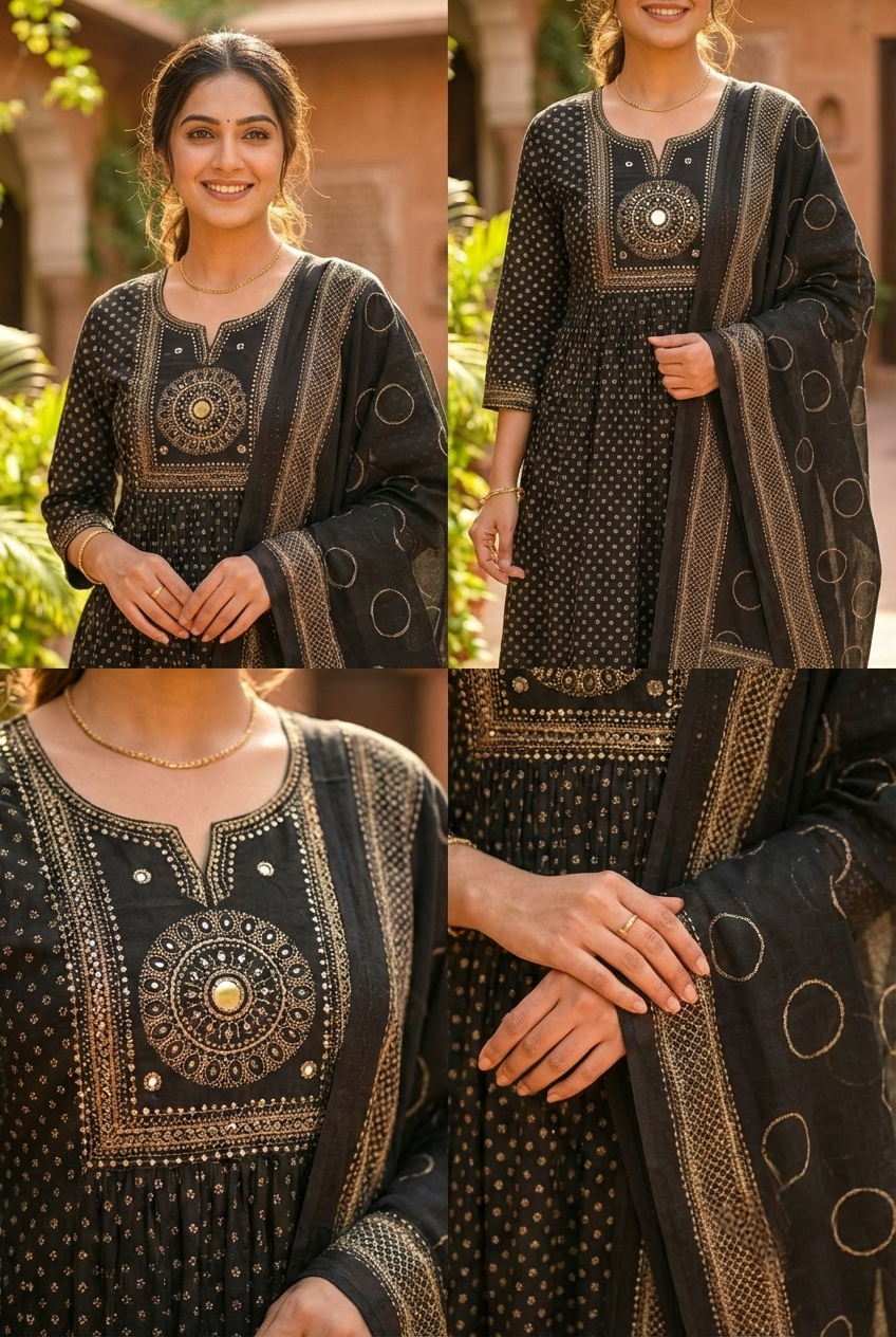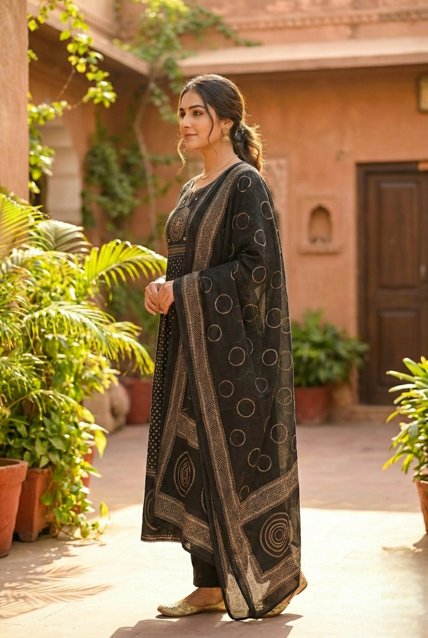 Elevate your everyday wardrobe with this versatile black cotton printed three-piece set. Crafted from breathable, high-quality cotton, this ensemble combines comfort with contemporary style. The thoughtfully coordinated pieces work beautifully together or separately, giving you multiple styling options for any occasion. The classic black base with printed details adds visual interest while remaining timeless. Perfect for those who appreciate quality fabrics and effortless coordination, this set makes getting dressed simple and stylish. Ideal for work, casual outings, or relaxed weekends.