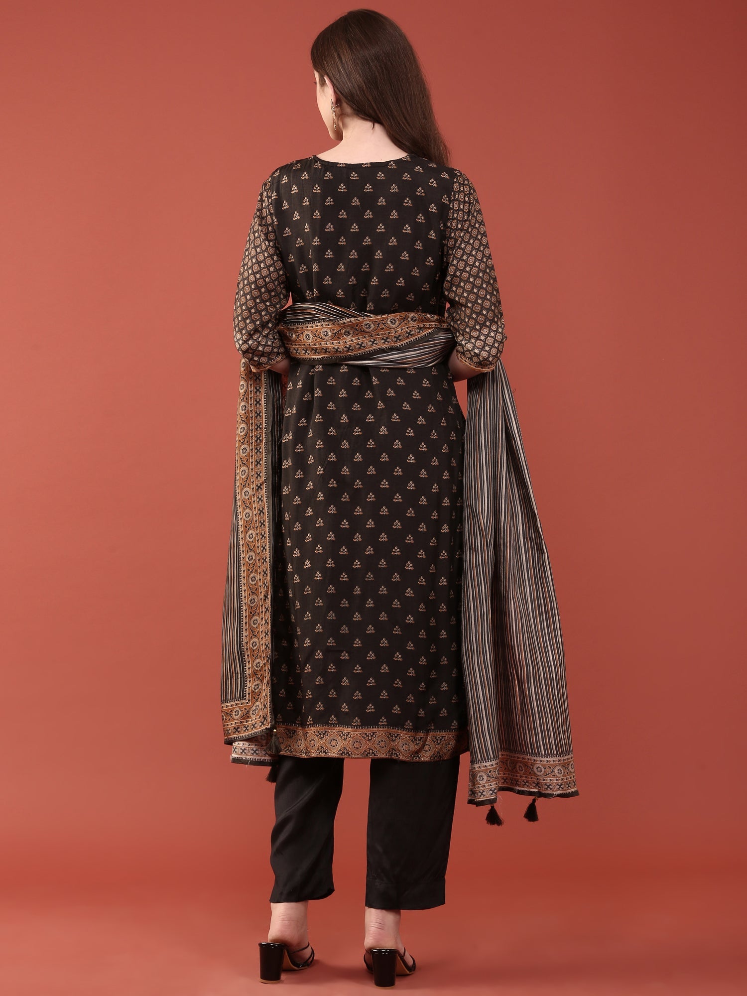 Elevate your ethnic wardrobe with this sophisticated Black Dola Silk Digital Print Three Piece Set. Crafted from premium dola silk, known for its luxurious drape and subtle sheen, this ensemble combines traditional elegance with contemporary design. The intricate digital print adds visual depth and modern flair to the classic silhouette. Perfect for festive occasions, celebrations, or formal gatherings, this versatile set offers comfort without compromising on style.