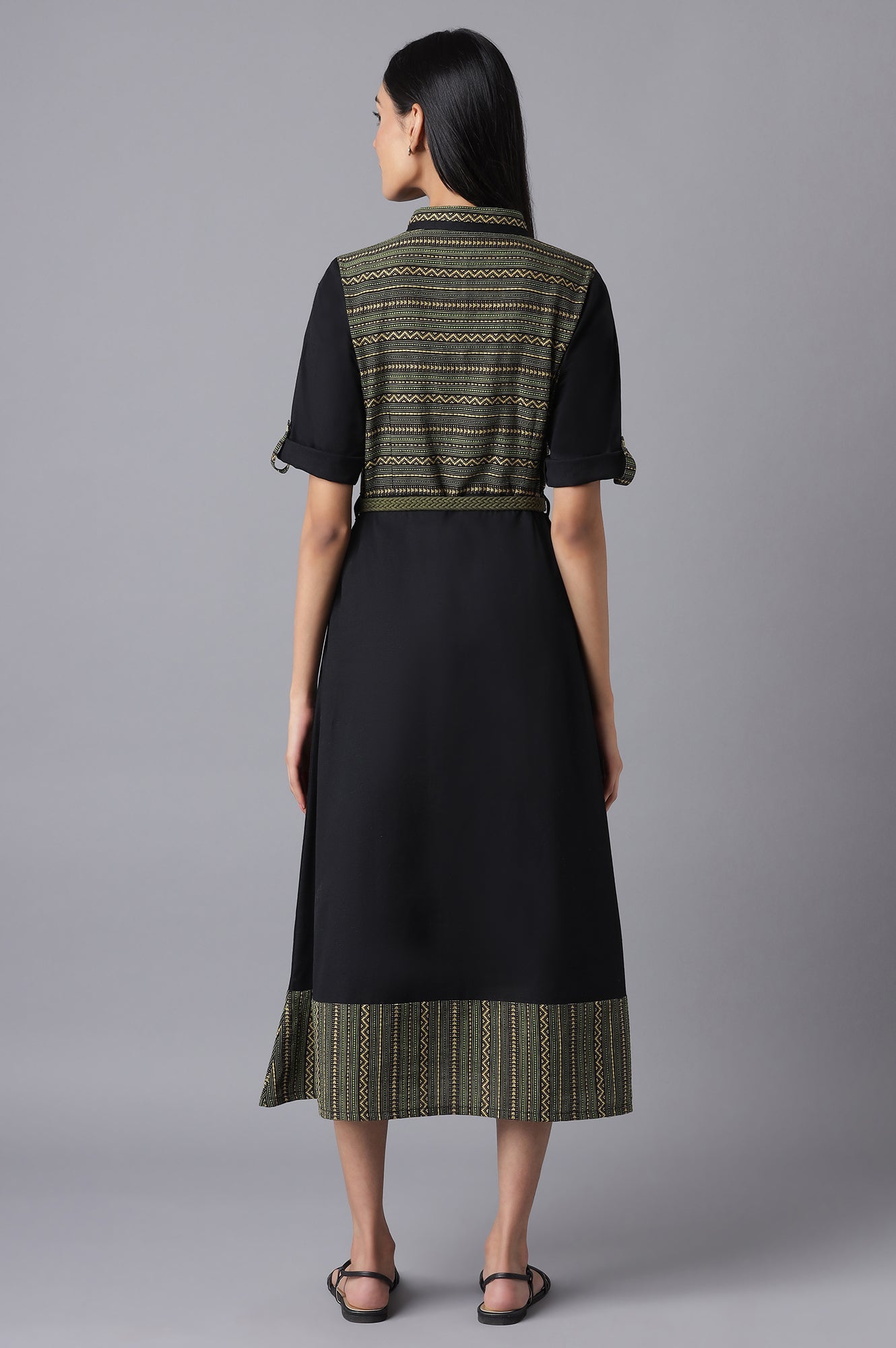 Make The Statement In This Classic Black Coloured Flared Dress By Aurelia. Crafted In Cotton, The Dress Has Shirt Collar With Button Placket And Geometric Print.