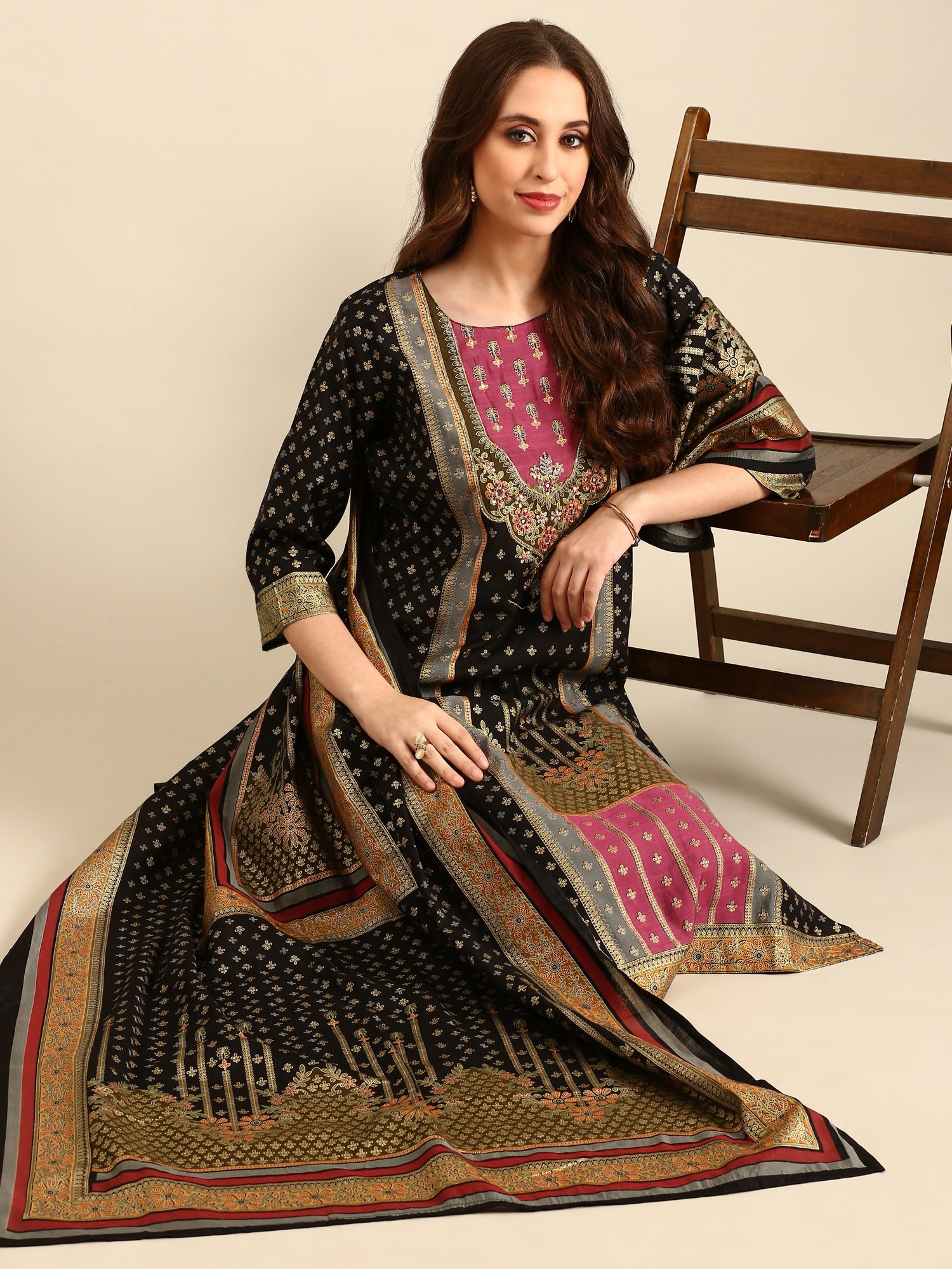 Experience elegance with this Black Foil Printed Kurta Set, crafted from luxurious black silk fabric featuring an intricate all-over foil print. The neckline showcases delicate kardhana work, enhanced by beads and subtle sequins that add a refined shimmer. Paired with a matching silk dupatta, this ensemble offers a sophisticated blend of traditional craftsmanship and modern style, perfect for festive occasions or formal events.