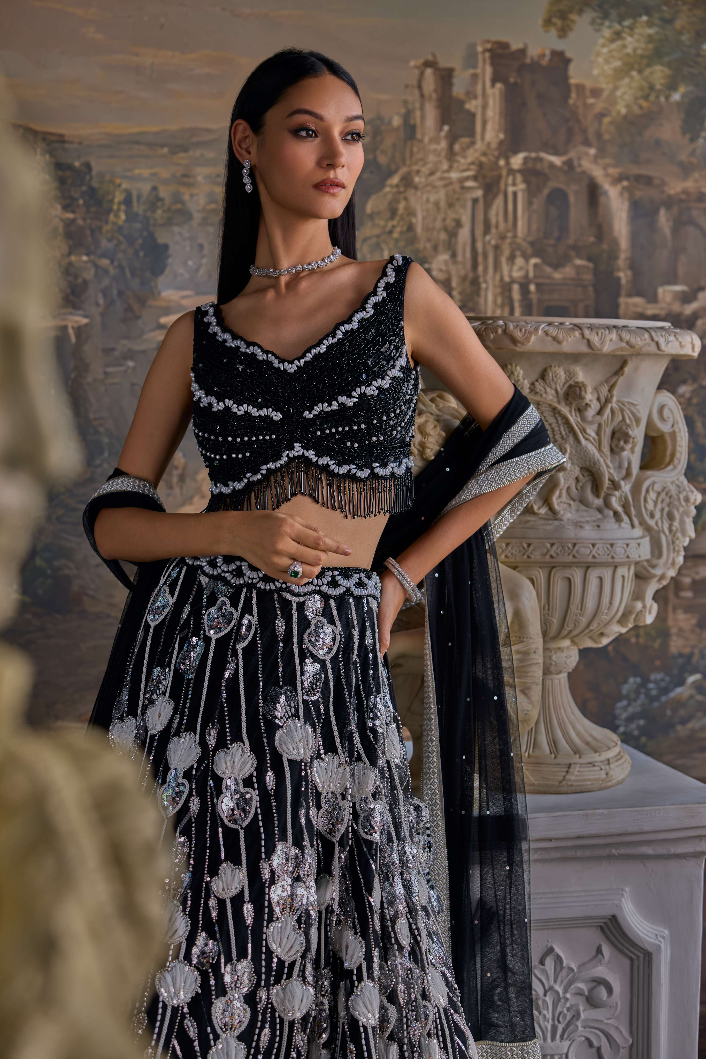 Elevate your traditional wardrobe with this Black Net Ghagra Set, featuring intricate heavy hand embroidery that adds timeless elegance. Crafted from delicate net fabric, it offers a graceful silhouette and a refined look, ideal for special occasions and festive celebrations. The detailed craftsmanship reflects exceptional artistry, ensuring you stand out with subtle sophistication.