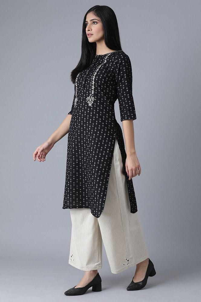 Black polka dots yarn dyed embroidered kurta in boat neck and three-quarter sleeves.