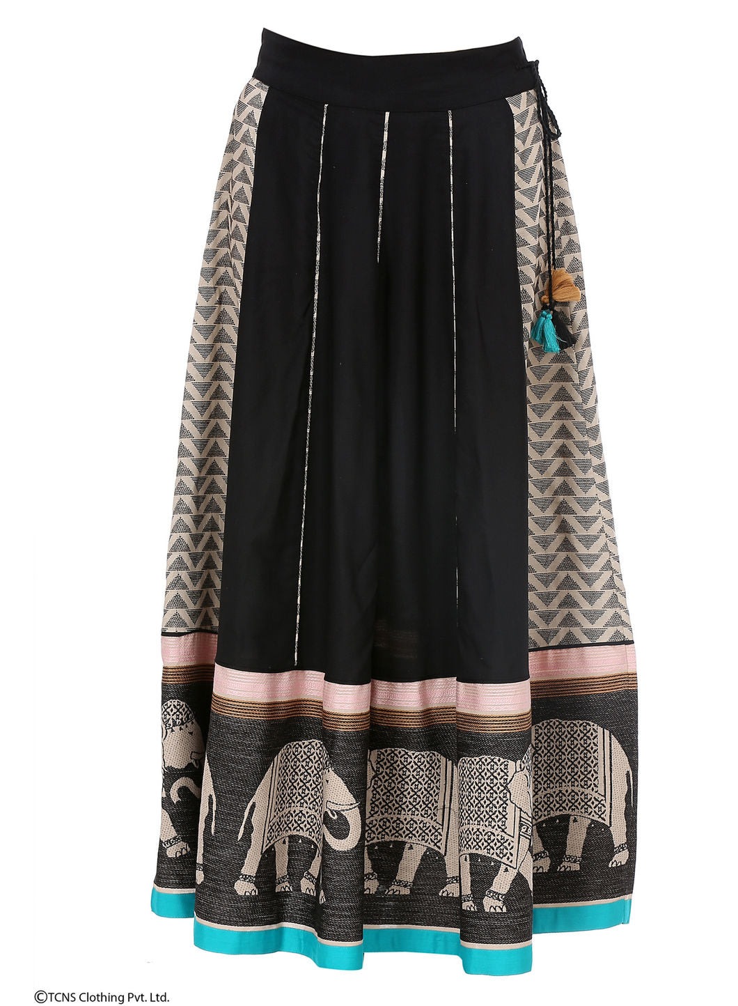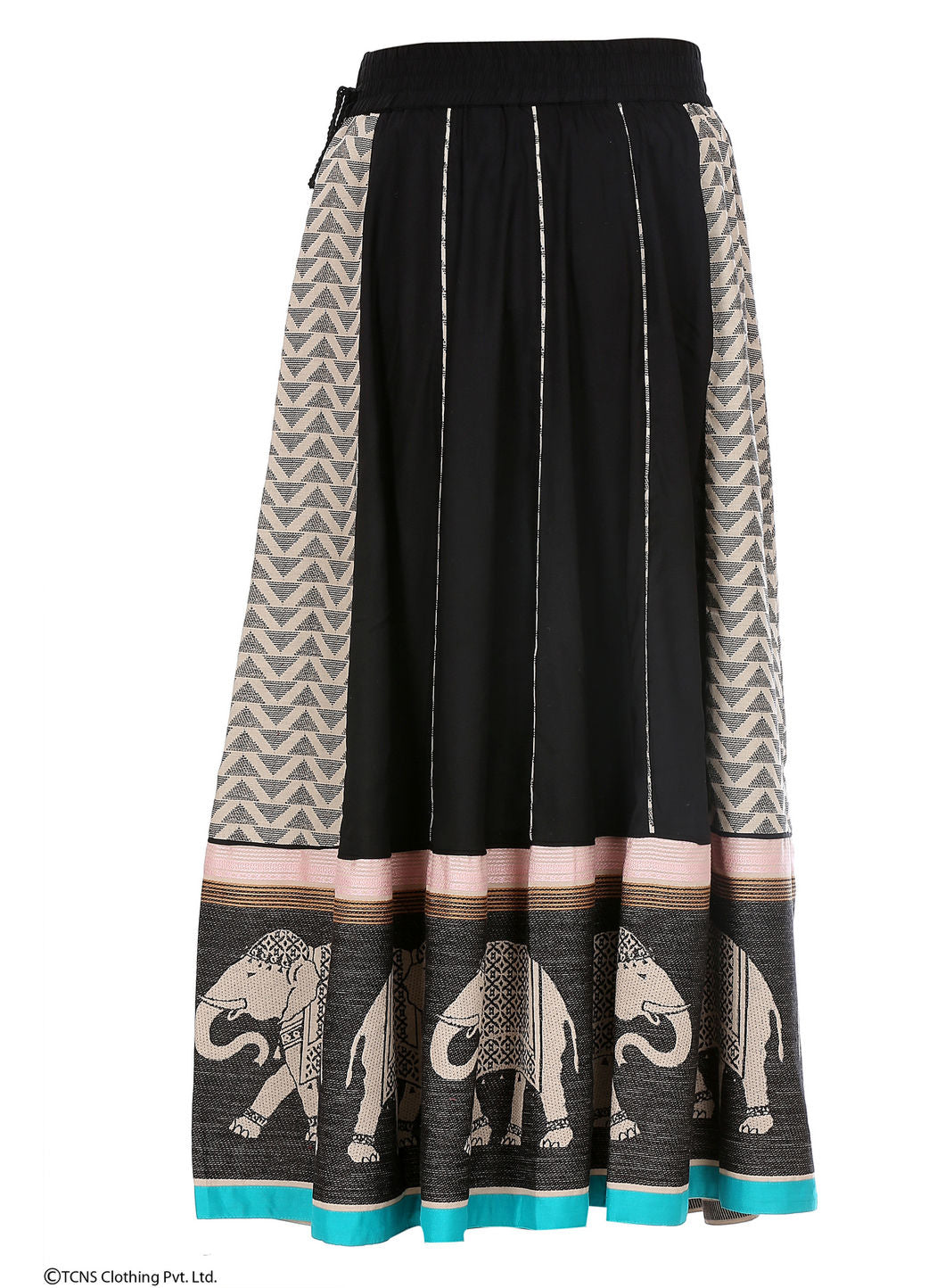 This black and beige printed skirt has printed detail, elasticated back, side zip with tie-up detail and flared hemline.