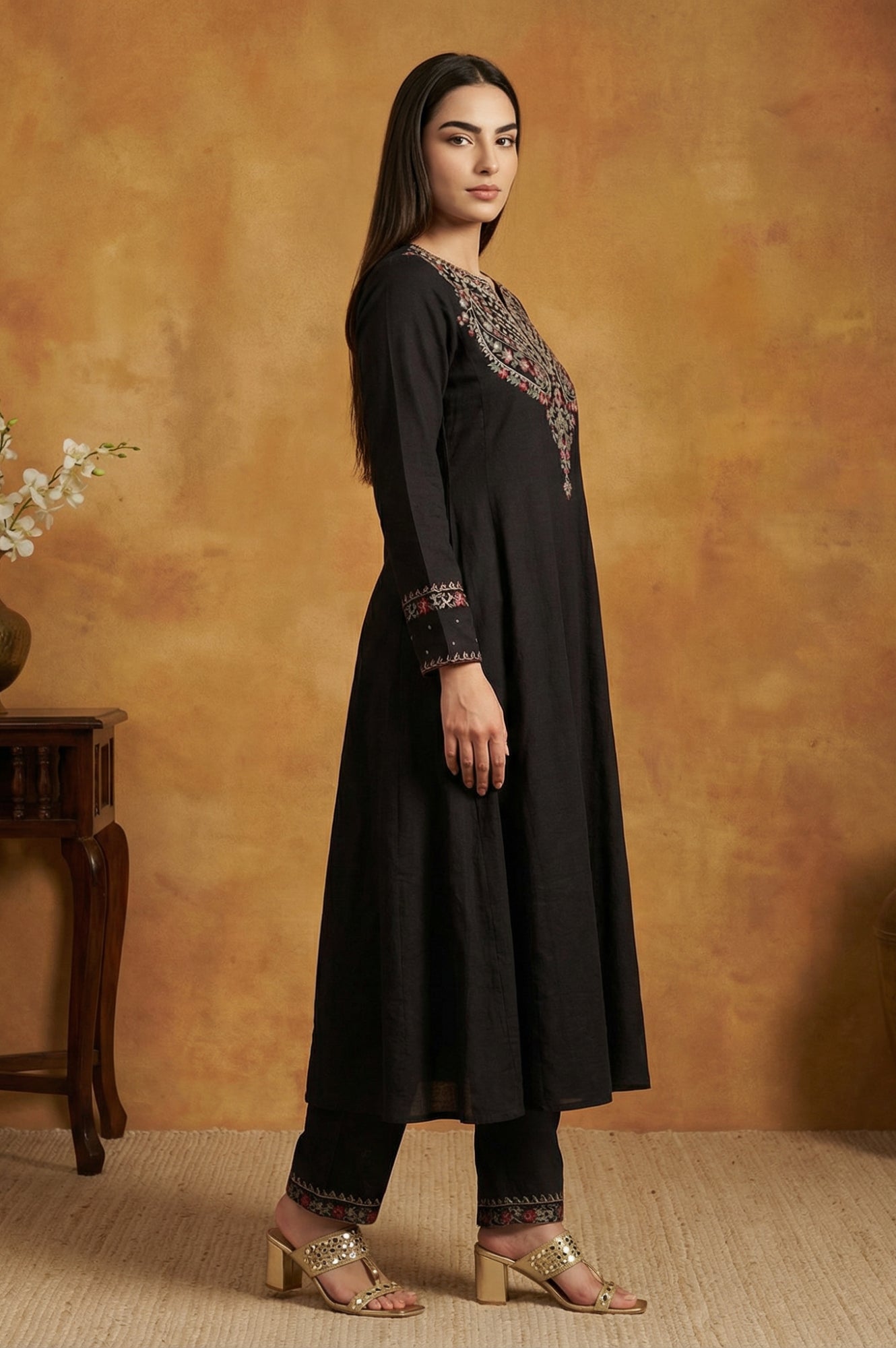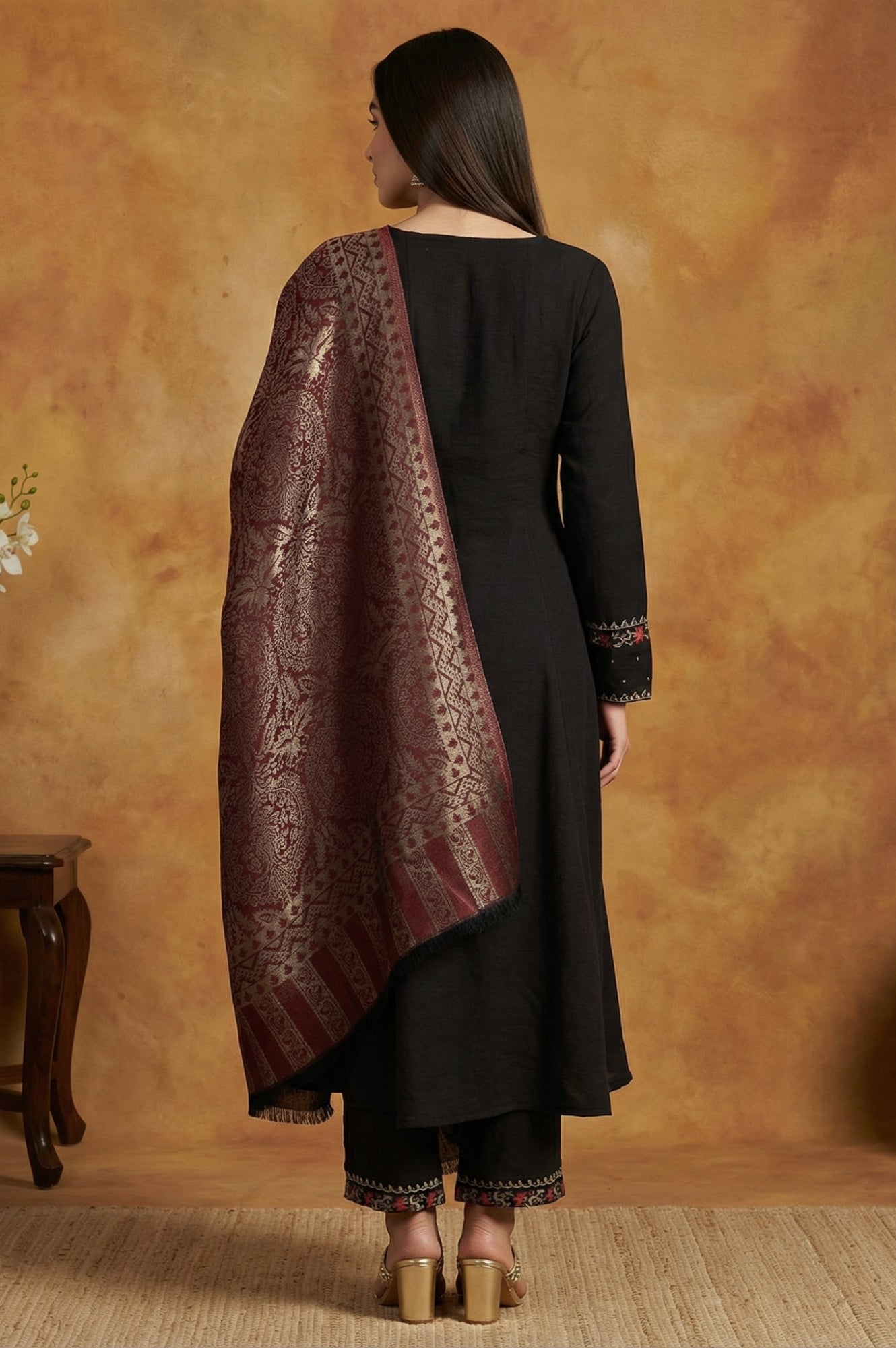 A timeless blend of elegance and tradition, this black embroidered Anarkali kurta set is perfect for festive occasions. The kurta features intricate embroidery on the yoke and cuffs, paired with straight pants for a balanced silhouette. The contrasting shawl with a rich woven design adds a regal touch, making it a must-have for your ethnic wardrobe.