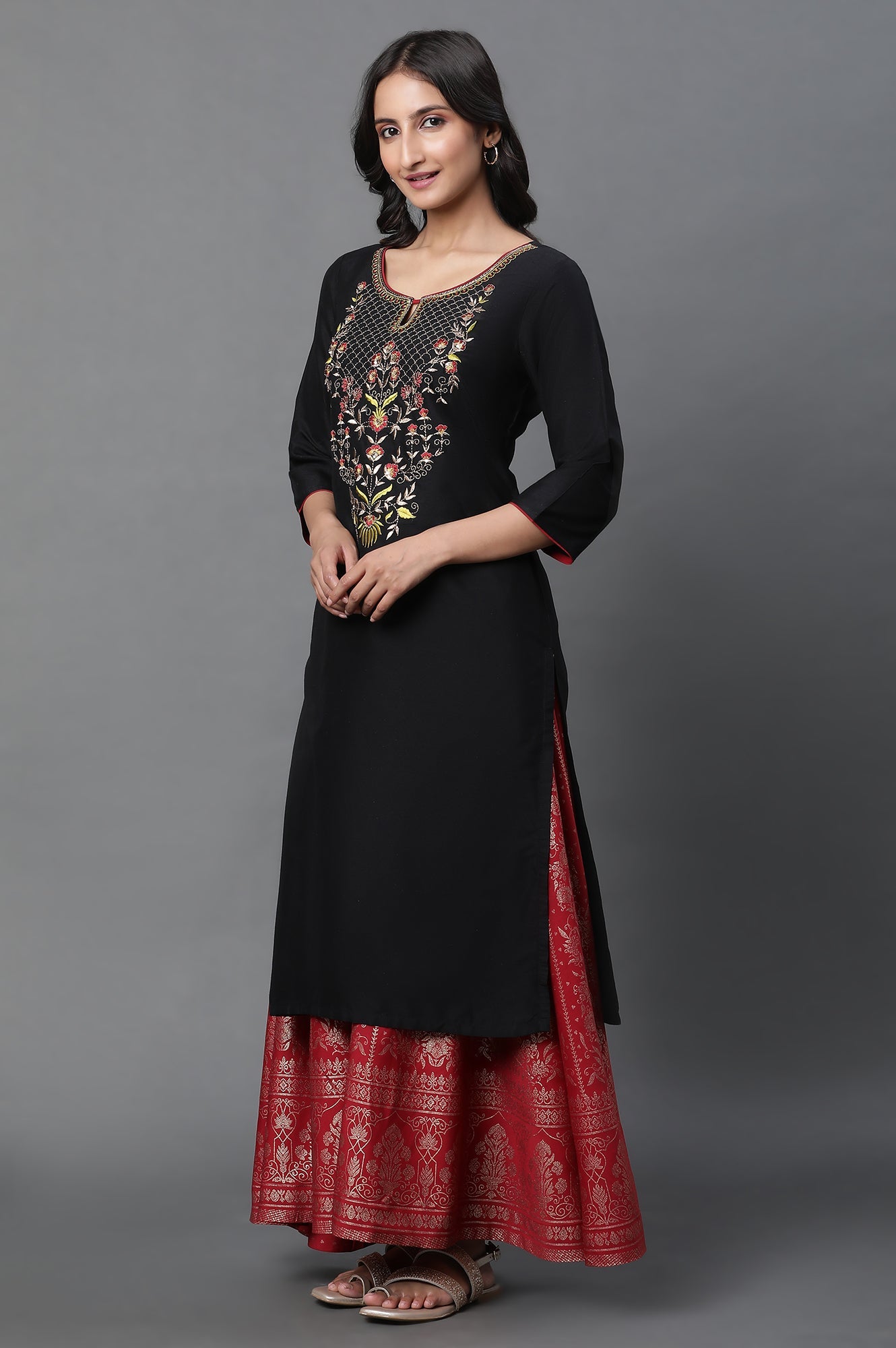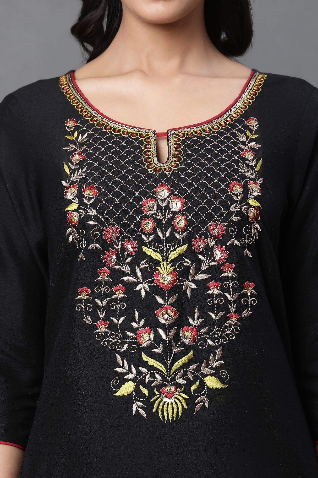 Indulge in the timeless elegance of this classic black coloured embroidered kurta, made with a viscose poly fabric for a rich and lustrous look. The round neck is accentuated with cutout and tab detail, enhanced with contrast piping for a chic look. The intricate embroidery work adds a touch of sophistication to the overall design.