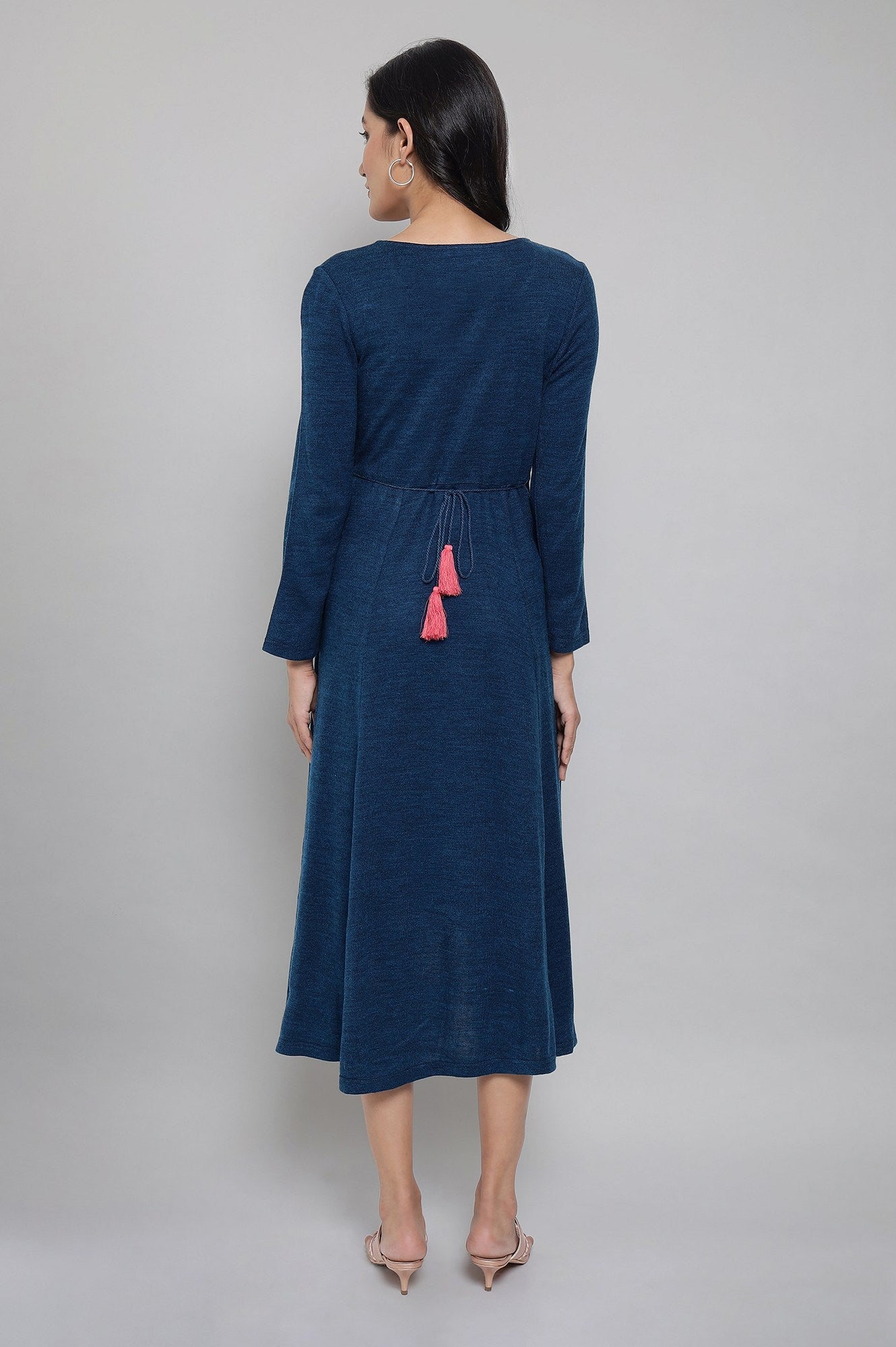 Be ready for the cold weather in style. Get this acrylic corsair blue dress in flared silhouette for an uplifted casual look. This knitted solid dress is adorned with thread embroidery in neckline.
