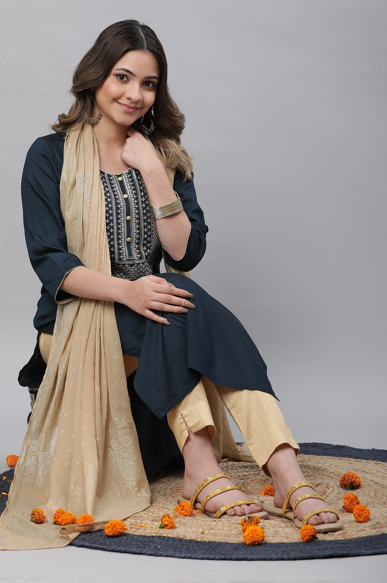 Amp up your style with this embroidered kurta. This kurta with gold embroidery and sequins is a much needed piece for your festive occasion. Its round neckline is accentuated with golden piping to enhance the look. Sequins in embroidery creates a glittering effect, making it more appropriate for a festive occasion.