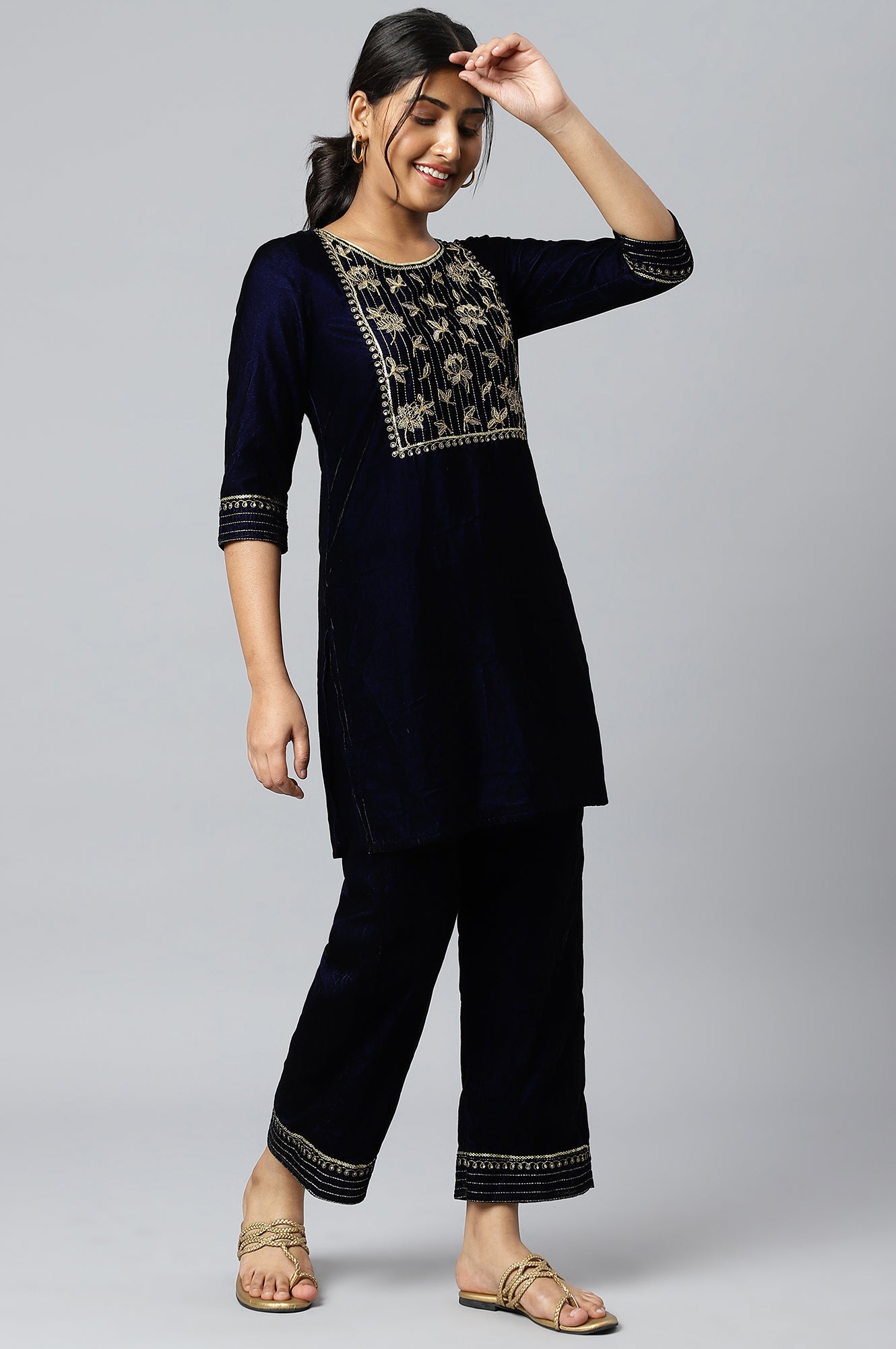 Impactful and striking, this two-piece set includes a short embroiderd kurta and an embroidered narrow palazzo. The embroidery is finely detailed and uses a variety of stitches to give it a contemporary look. Its definately a perfect style that'll make you instantly put together.