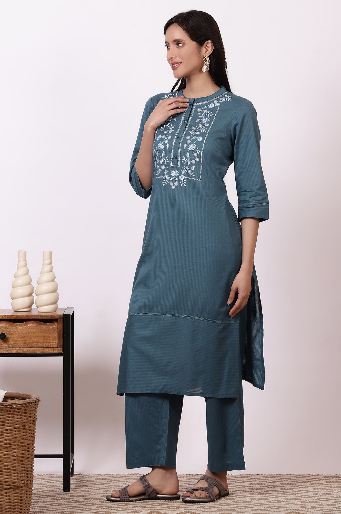 Blue Embroidered Yoke Pure Cotton Straight Kurta and Pants Set