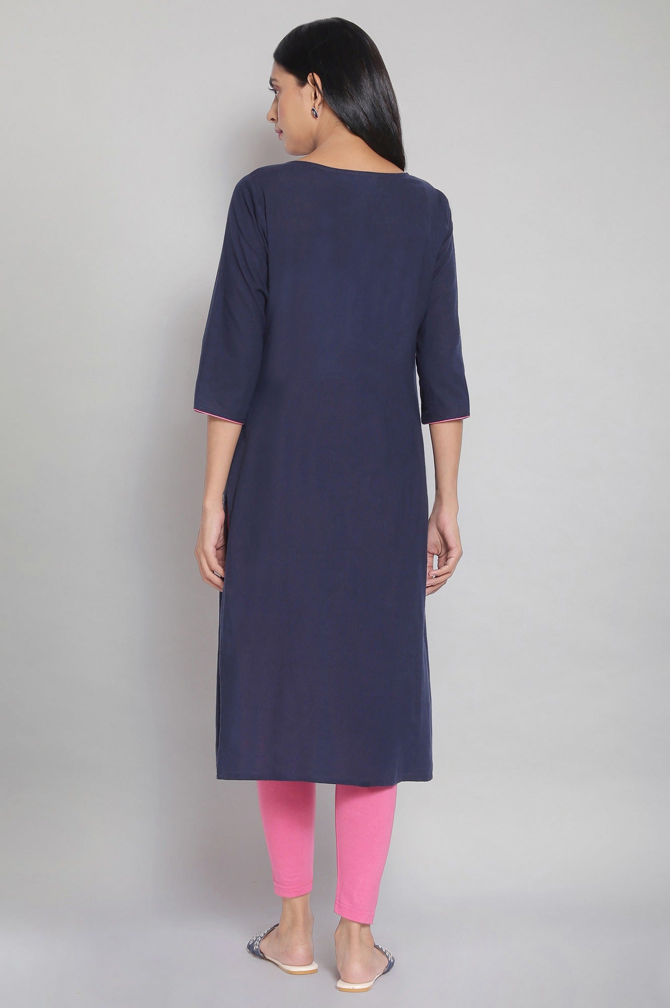 Blue round neck three-fourth sleeve kurta with printed detail, flared hem and border detail.