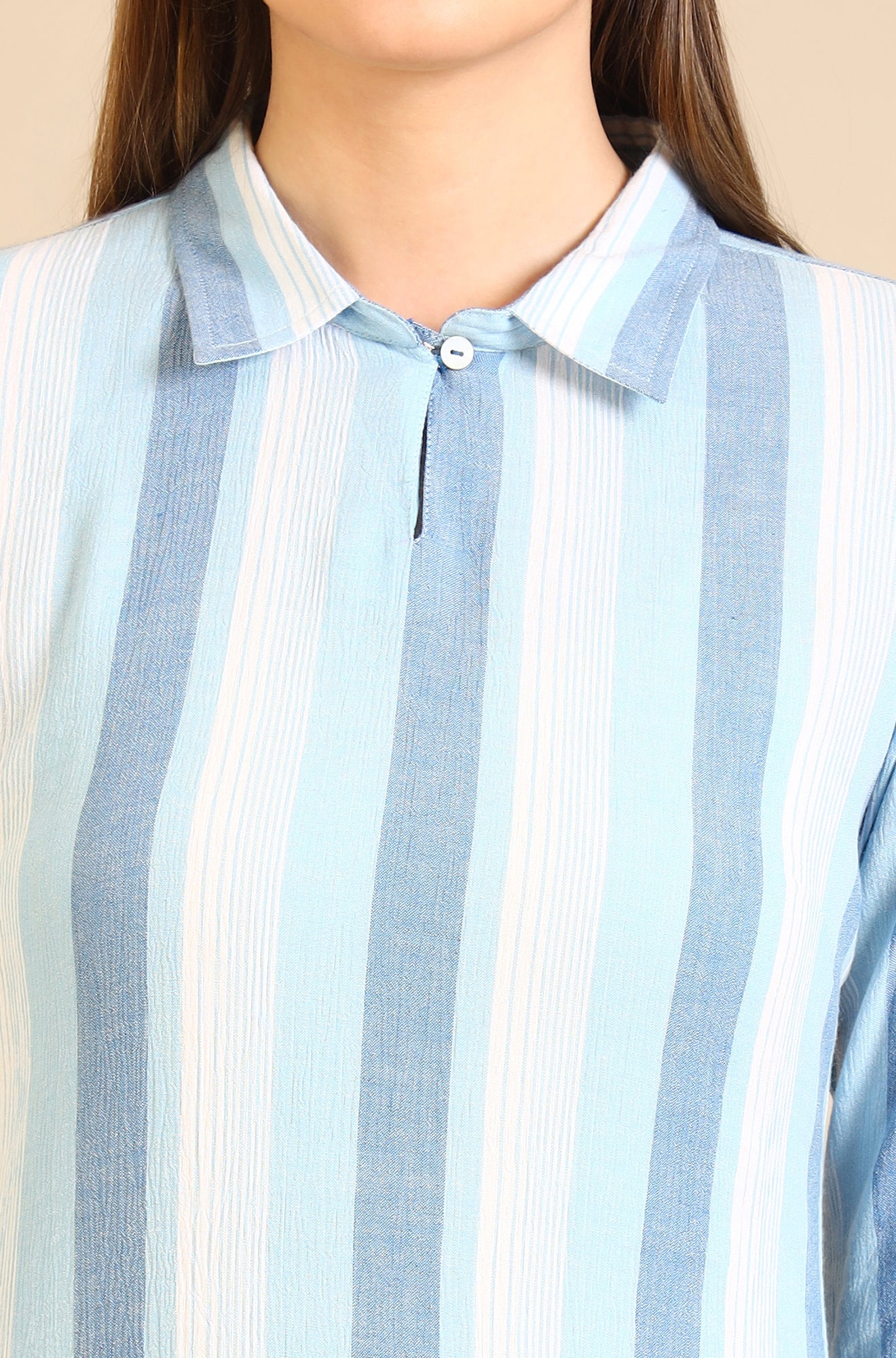 This straight kurta combines casual sophistication with stylish details. Featuring a shirt collar with a slit and button closure, along with mock pocket detailing for a modern twist, it’s perfect for effortless chic. The 3/4th sleeves are enhanced with a border for added elegance. Crafted from soft crepe fabric in a refreshing blue and white colour combination, this kurta offers both comfort and versatility for everyday wear or semi-formal occasions.