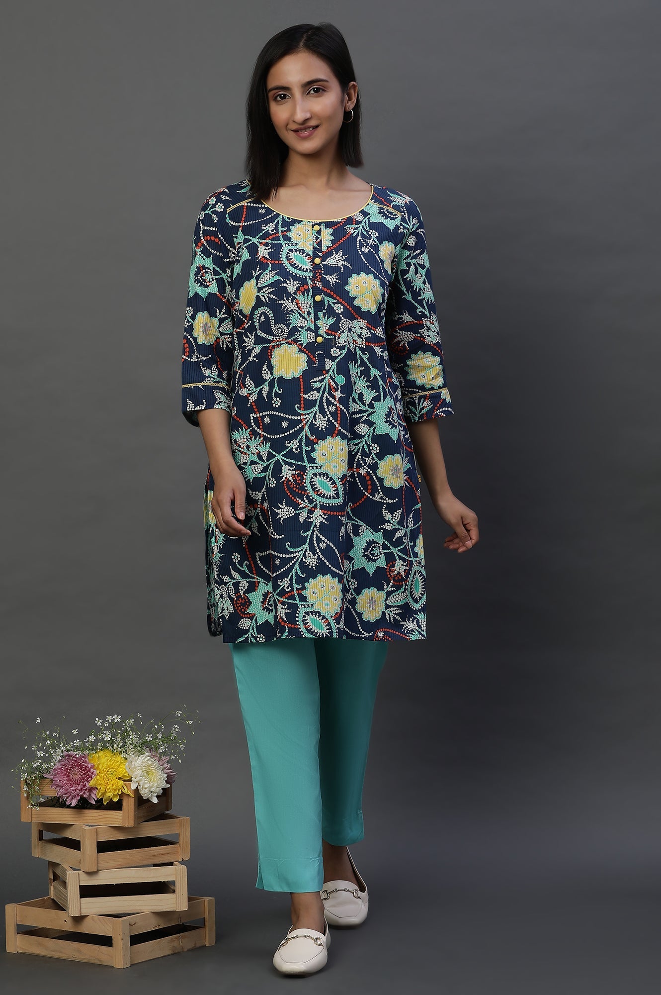 Style the trouser pants with Aurelia's new range short kurtis and footwear.